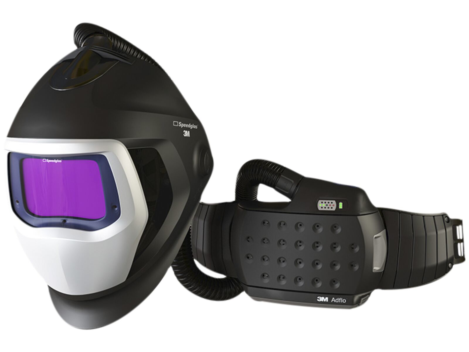 Speedglas svejseskærm 9100 Air med svejsekassete 9100XXi og Adflo turboåndedrætsværn. Det særlige 9100XXi sølvfrontpanel indeholder udvendige betjeningsknapper, der giver hurtig og nem adgang til slibnings- og hukommelsestilstand. Det er muligt at fastlåse en hvilken som helst DIN-grad, f.eks. DIN 3 under slibning. Forsinkelsesfunktion til indstilling af åbningstiden fra mørk til lys. Ny optisk løsning får synsfeltet til at se lysere, mere detaljeret og mere farverigt ud. Automatisk tænd/sluk. Variabel DIN-grad 5, 8 eller 9-13 til de fleste typer buesvejsning. Forsinkelsesfunktion til indstilling af åbningstiden fra mørk til lys. Skiftetid (lys-mørk) 0,1 ms. Følsomheden ved lysbuesvejsning kan justeres for at opnå enestående pålidelighed i skiftene. Med den rigtige filtertype beskytter Adflo åndedrætsværnet dig effektivt mod både partikler og visse gasser – alt sammen i ét system. Den slanke profil og det ergonomiske design gør det endnu lettere og mere praktisk i forhold til at være nemt at bruge under trange pladsforhold. Gasfiltre sælges separat. Du kan vælge at udskifte enten partikel- eller gasfilteret efter behov: du behøver ikke skifte begge filtre på samme tid.