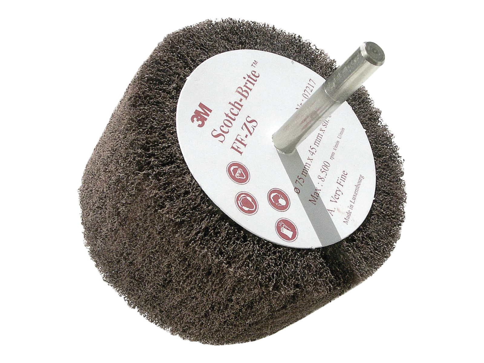 Scotch-Brite skaftmonteret flapbørste FF-ZS Ø75×45×6 mm S FIN grå. Flapbørsten har et jævnt, mat ridsemønster, hvilket giver en ensartet overflade uden slidmærker. FF-ZS er beregnet til polering og rengøring og producerer en finere overflade end kombinerede flapbørster.