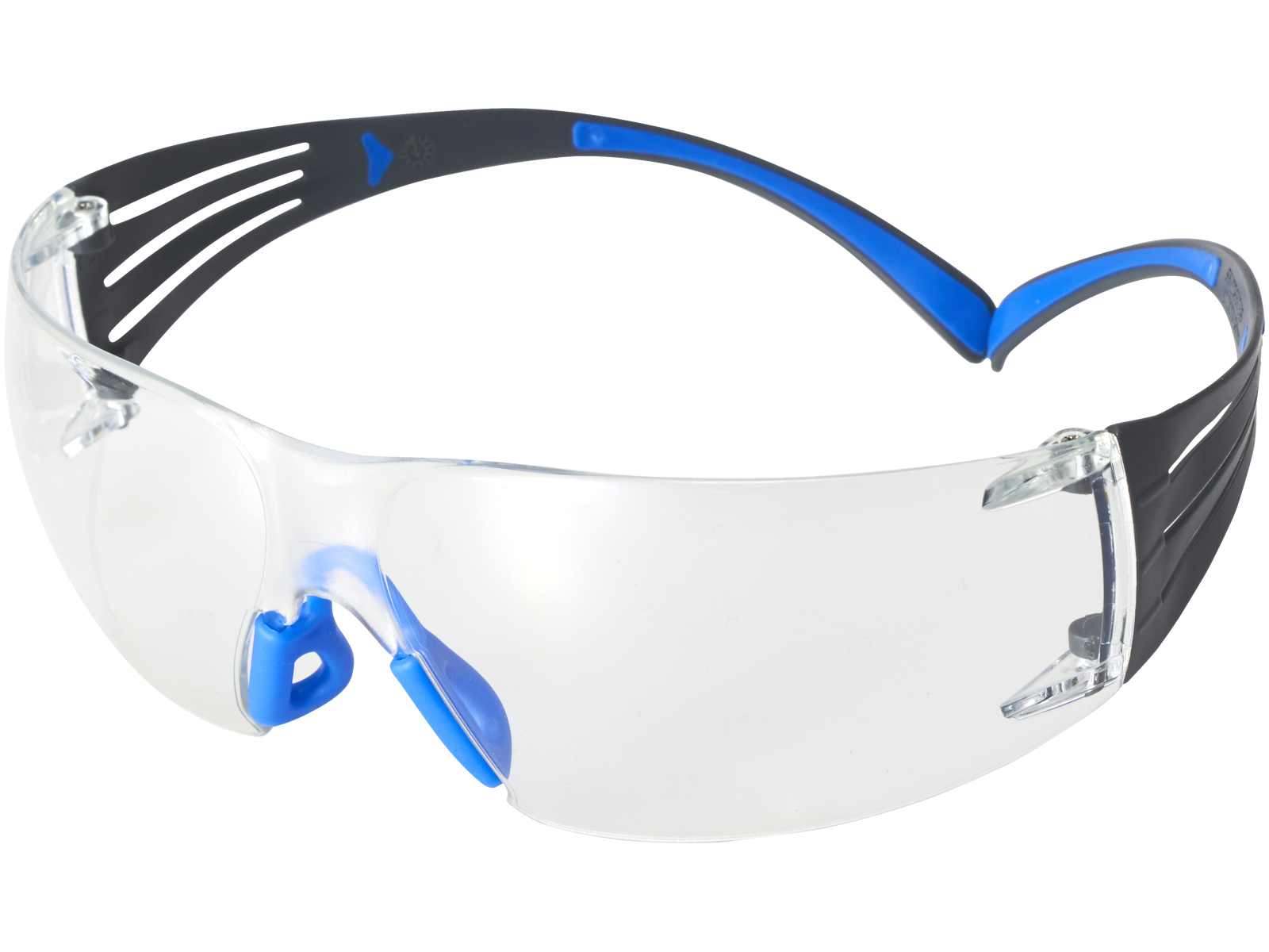 3M™ SecureFit™ 400 beskyttelsesbriller SF401SGAF-BLU EU, blåt/gråt stel, Scotchgard™ anti-dug, klar linse, består af én linse uden ramme, brede, fleksible brillestænger sikrer robust sidebeskyttelse og er det perfekte valg i kombination med høreværn. Brillestængerne er også forsynet med 3M™ Pressure Diffusion Temple-teknologi (PDT), der gør, at brillestængerne tilpasser sig naturligt til alle hovedstørrelser, hvilket sikrer brugeren sikker og komfortabel pasform. Sidder sikkert fast, også ved bevægelse af hovedet. Bløde, justerbare næsepuder giver mulighed for optimal, individuel tilpasning. 3M™ Scotchgard™ anti-dug coating modvirker dug i længere tid end traditionelle coatings, selv efter flere vaske.