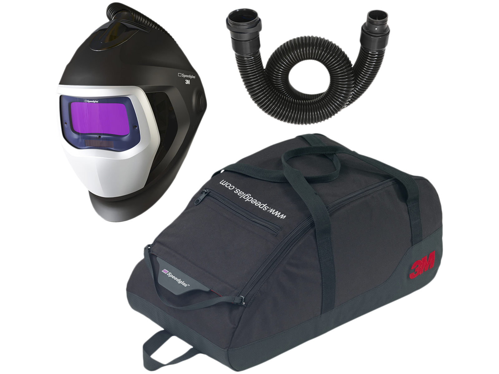 Opgraderingssæt med 9100 Air svejseskærm, 9100V svejsekassette, selvjusterende QRS-luftslange og bæretaske.