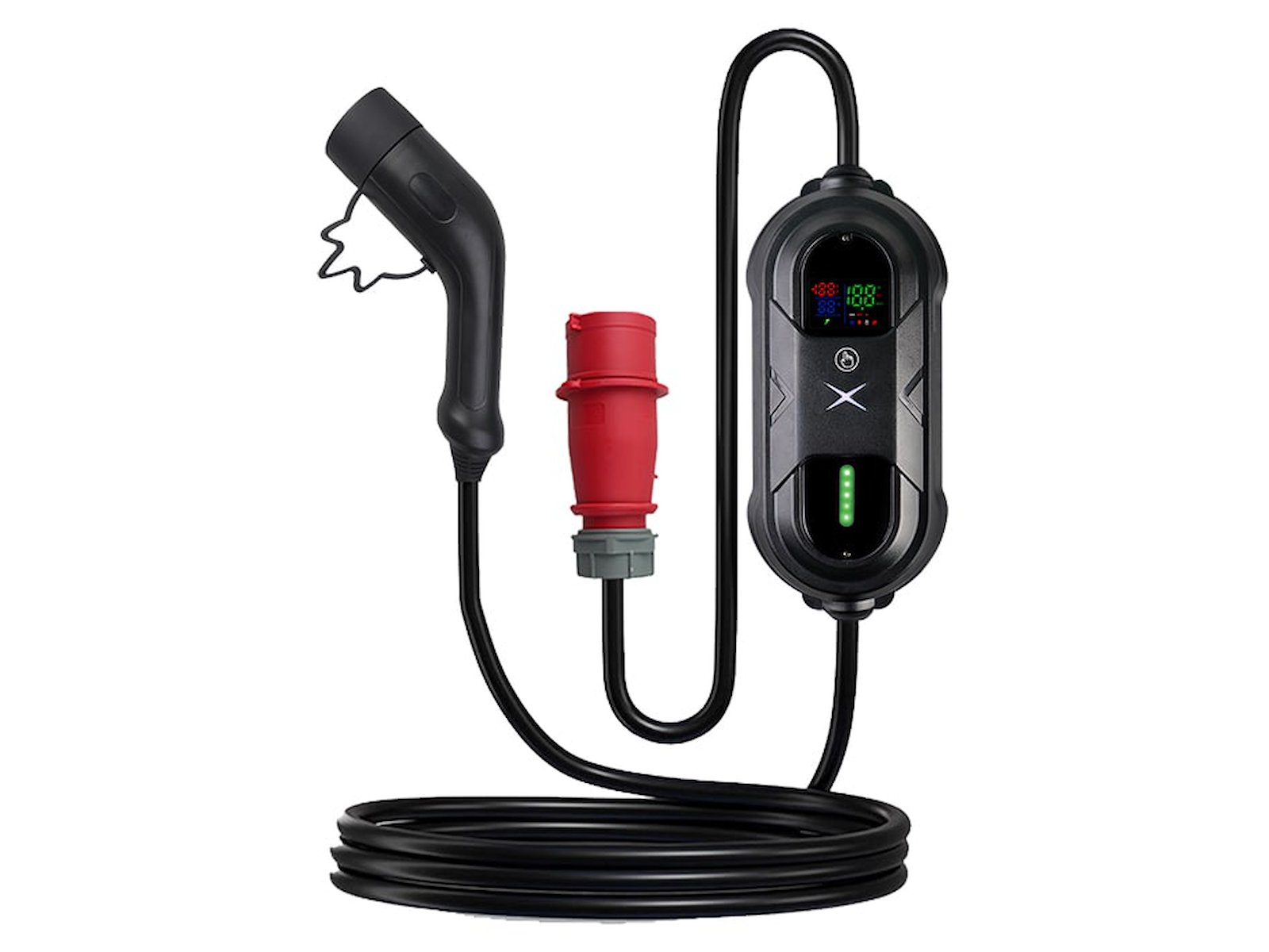 Laderen har et 1 meter langt kabel med CEE-stik (rødt industristik, også kaldet "kraft") i den ene ende og et 6 meter kabel med Type 2-stik i den anden – hvilket gør den ideel til hurtig opladning både hjemme og på arbejdspladsen. I alt 7 meter kabel.