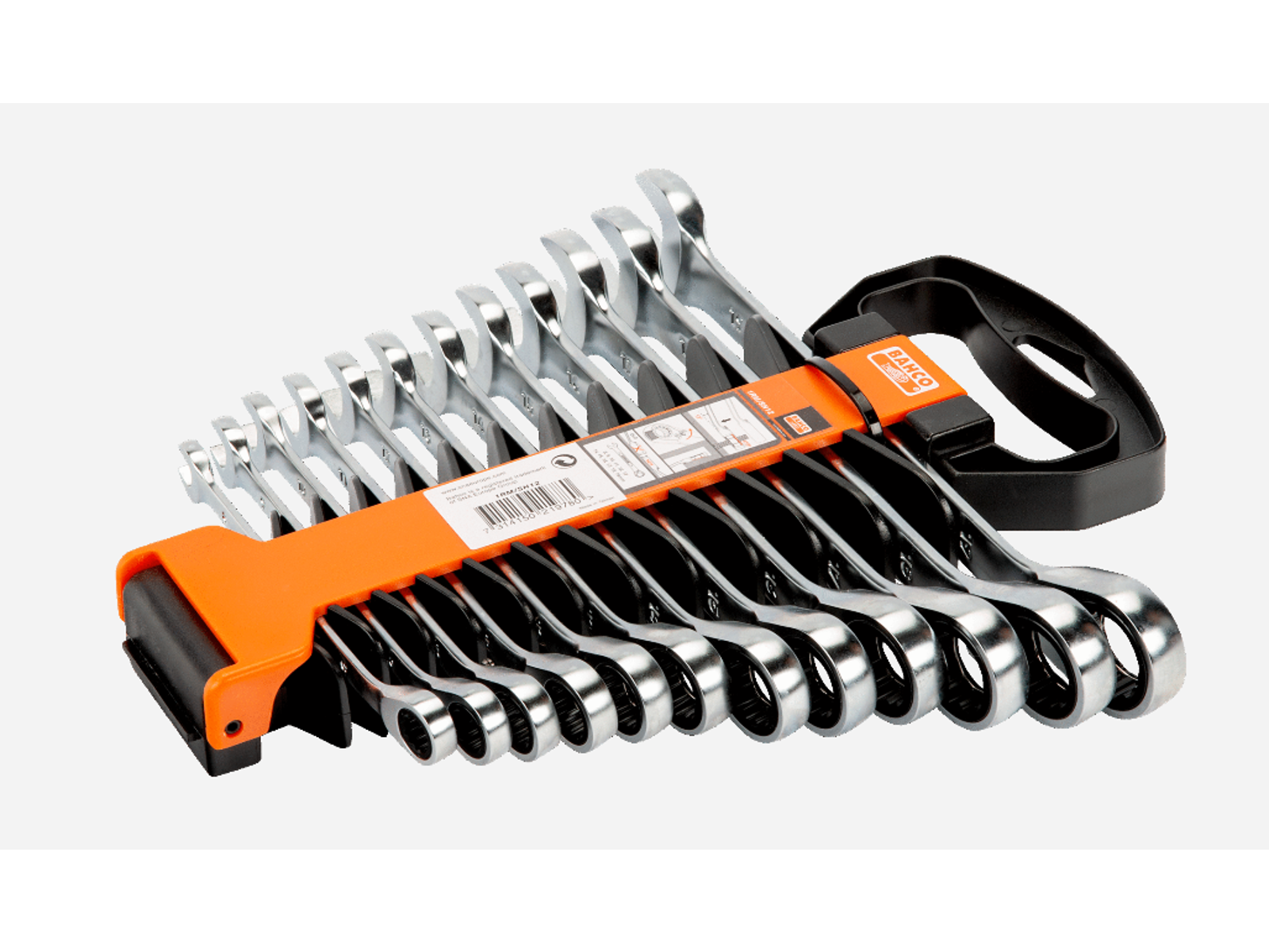 Ring-skraldenøgler i sæt. Leveres med praktisk bærehåndtag i hård plast, med hul til vægmontering.