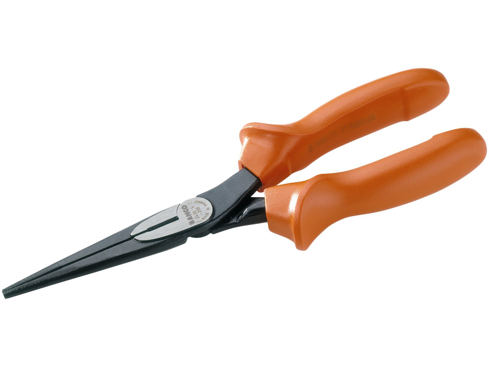 Spidstang, isoleret. ISO 5745, IEC 60900. Sort finish, rustbeskyttet. Højtlegeret stål, plasthåndtag med store stopvinger. Lange, halvcirkelformede kæber med tværriflede gribeflader. Nøjagtige og hærdede skær for klipning af blødere materialer som kobber og plastisolerede kabler. Afrundede kæber som gør tangen velegnet, hvor pladsen er trang.