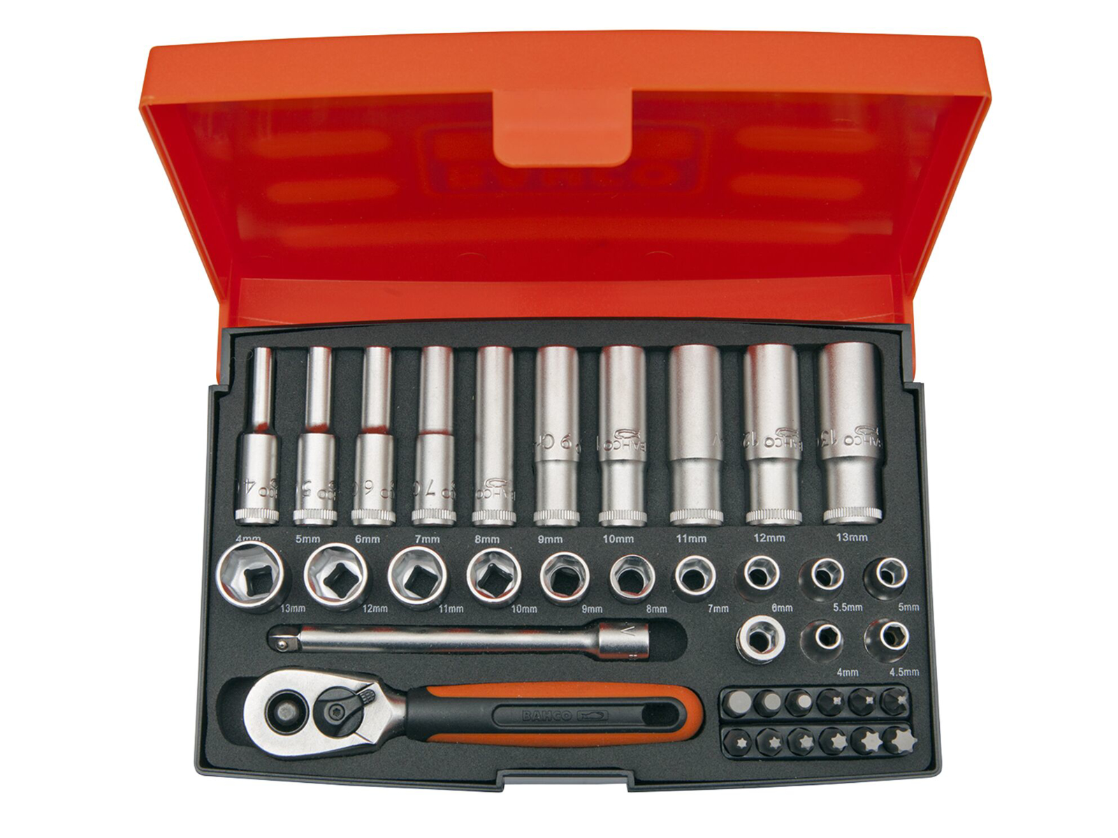 Indeholder lange og korte toppe 4-13 mm, stubby skraldenøgle, bits-adapter, forlænger og diverse bits.