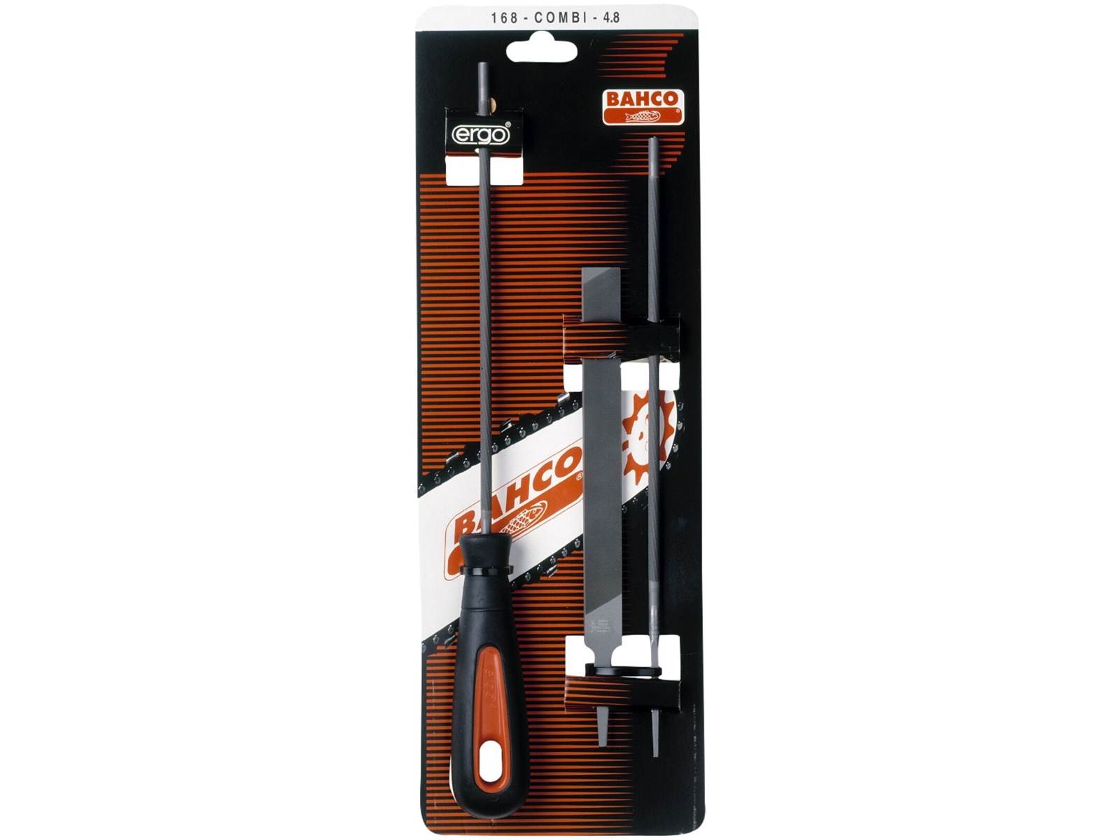 Filehæfte udviklet i henhold til Bahcos ERGO™ program. Sæt bestående af 2 stk. runde kædesavfile. Desuden 1 stk. 6" flad kædesavfil.