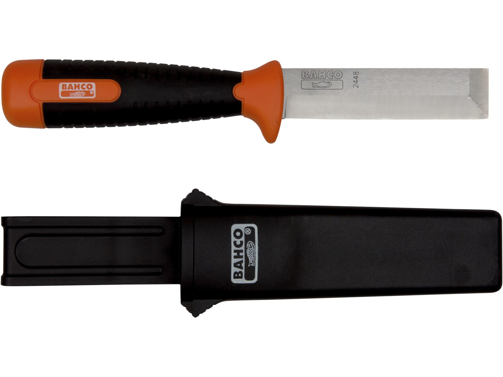 Stemmejernskniv, til krævende snedker samt bygge- og anlægsarbejde. Håndtaget er fremstillet i slagfast to-komponent materiale og forsynet med beskyttelseskant og afrundede "skuldre" for optimal sikkerhed. Klingen er præcisionsslebet for maksimal skarphed, og tåler slag med hammer. Hærdet til 58-61 HRC for ekstra lang levetid. Klingebredde: 4 mm. Klingelængde: 100 mm. Leveres med praktisk beskyttelsesskede.