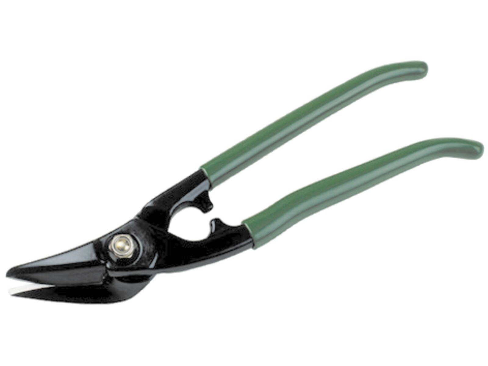 Induktionshærdede skær med en hårdhed på 59 HRC. Særlig velegnet til klipning af huller og små kurver. Øverste skær er let riflet, så saksen ikke glider ved klipning af slidser og trimmeopgaver. For lige- og højreklip i normale pladetyper. Plastdyppede håndtag.
