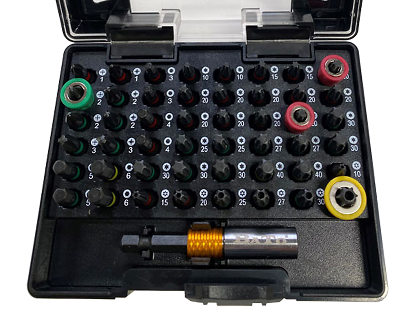 Sættet indeholder 1 stk PH1, 2 stk PH2, 1 stk PH3, 1 stk PZ1, 2 stk TX10, 2 stk TX15, 9 stk TX20, 2 stk TX25, 2 stk TX27, 4 stk TX30, 2 stk TX40, 1 stk TX tamper 10, 15, 20, 25, 27, 30 og 40. 6kt 3mm × 2, 4mm × 2, 5mm × 2, 6mm × 2. Bitsholder slim Quick lock 65 mm. 2 stk rød magnet ringskrueholder. 1 stk grøn magnet ringskrueholder. 1 stk rød magnet ringskrueholder.