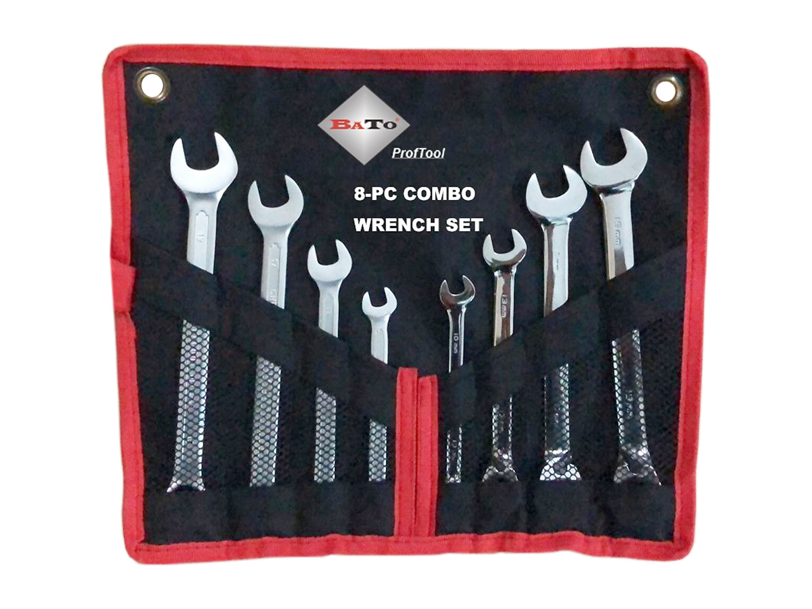 Kombisæt med 8 dele. Sættet består af 4 ringgaffelnøgler (10, 13, 17 og 19 mm) og 4 ringskraldenøgler (10, 13, 17 og 19 mm). Leveres i stofetui.