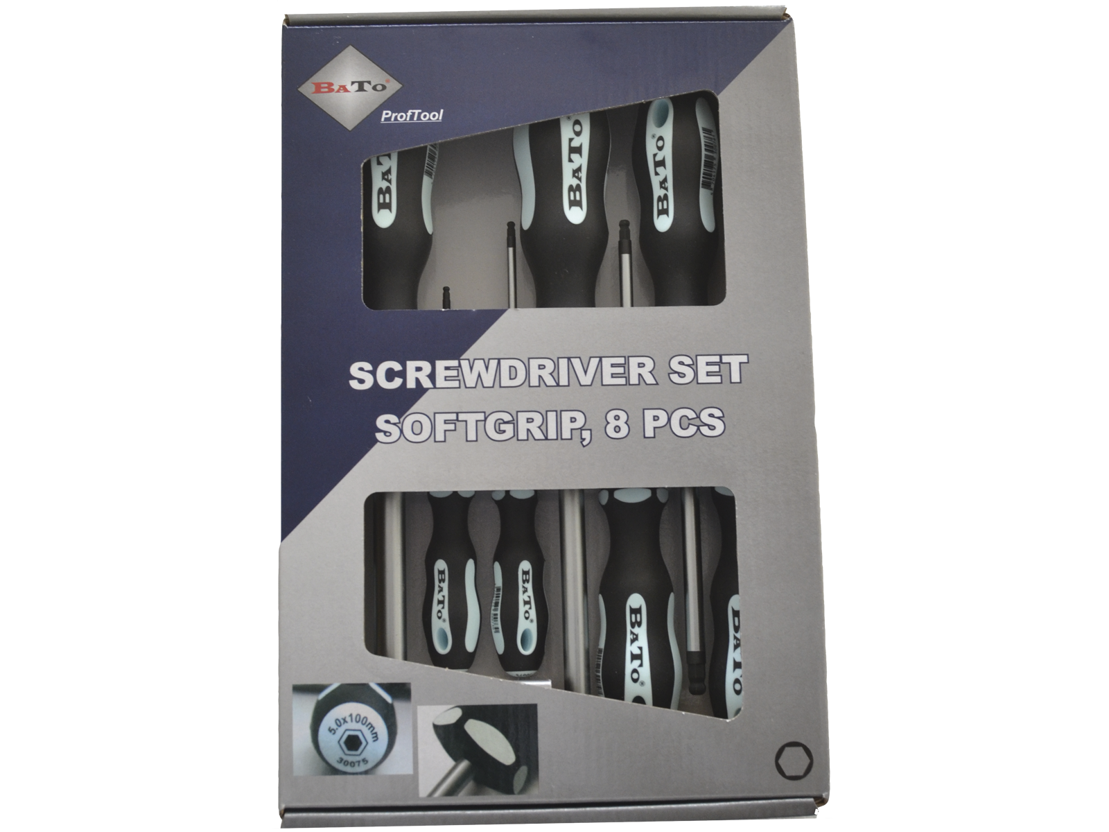 Skruetrækkersæt med 8 dele. Skruetrækkere med kugle, udv. 6kt (hex) og softgreb. Indeholder 2,0 / 2,5 / 3,0 / 4,0 / 5,0 / 6,0 / 8,0 og 10,0 mm.