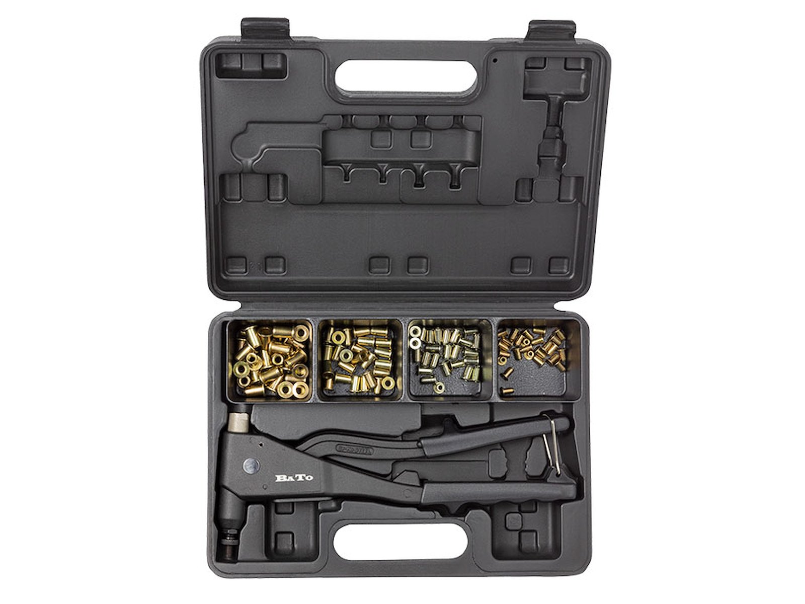 Blindmøtrik-montørsæt med håndnittetang med kapacitet M3 til M6 (rustfri M3 til M5) og fire slags møtrikker. Leveres i kraftig plastkuffert.