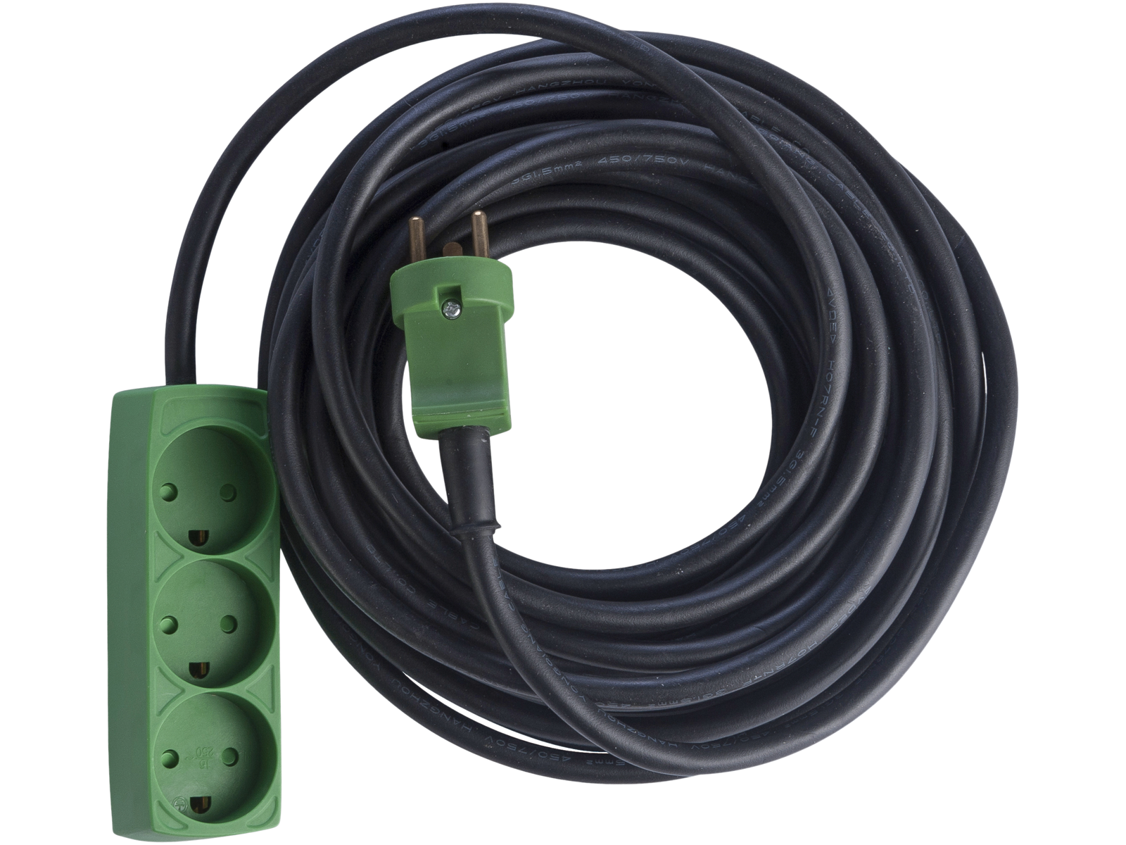 Kabelsæt med DK stikprop og 3-vejs stikdåse med jord. Med 3×1,5 mm² neopren-gummikabel H07RN-F. 230 V, 16 A. 3.680 W. IP20. Fås i 3 længder: 10, 15 og 25 mtr.