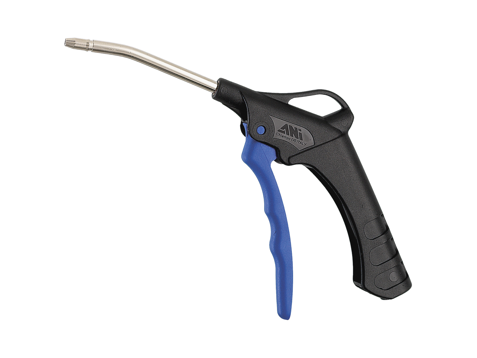 Blæsepistol med 90 mm langt, buet messing dyse. FLAIR´s professionelle AP blæsepistoler er fremstillet i slagfast PA6 materiale. Kan modstå en belastning på op til 350 kg. Messingbøsninger, der tillader et hurtig skift af dysen eller niplen uden at beskadige pistolen.