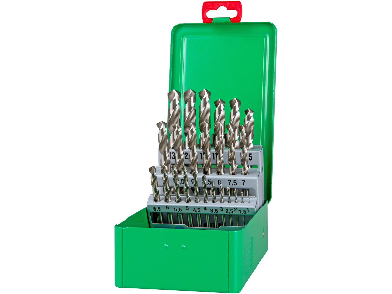 Borsæt DIN338 HSS-G med slebne spiralbor 1-13×0,5 mm i grøn DJ stålkassette. Til anvendelse i stål, stålgods legeret og ulegeret op til 900 N/mm² styrke. Grå-, temper-, sejjern- og trykgods, sinterjern, nysølv, grafit, kortspåntagende aluminiumslegeringer, messing og bronze.