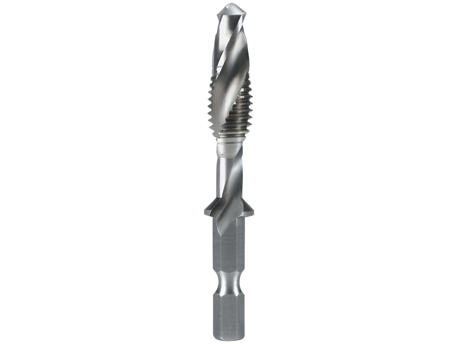 Kombi-tappen med 1/4" skaft (bit) for kerneboring og gevindskæring. Kombi-tappen er ideel til pladebearbejdning med højre- og venstreløbede akkuboremaskiner. Gevindet skæres i en arbejdsgang, uden at skifte værktøj, da spiralboret sidder i forenden på snittappen. Flanke: bagslibning. Skaft: 6,35×27,0 mm. Kombi-tappen med 1/4" skaft (bit) for kerneboring og gevindskæring. Kombi-tappen er ideel til pladebearbejdning med højre- og venstreløbede akkuboremaskiner. Gevindet skæres i en arbejdsgang, uden at skifte værktøj, da spiralboret sidder i forenden på snittappen.