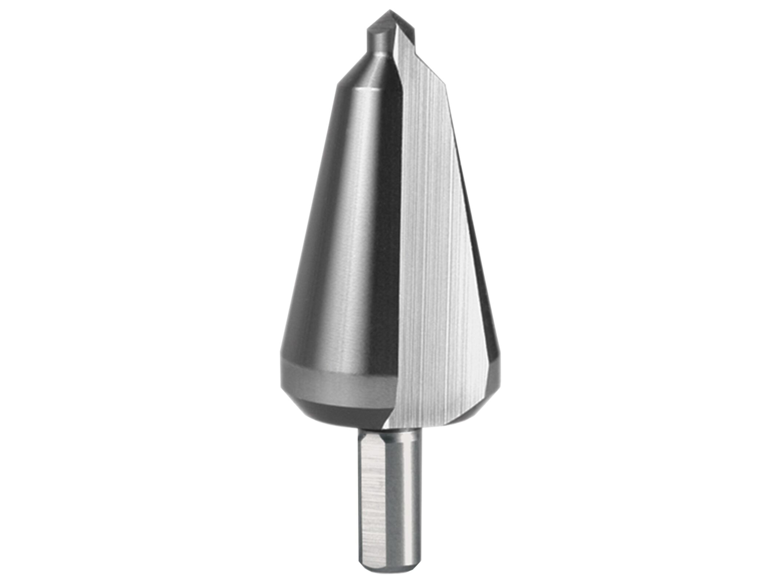 Pladebor HSS, CBN slebet med krydsslibning. Str. 3) 16,0-30,5 mm. Den dybslebet og snoet spånkanal giver et helt roligt løb og stor skærekapacitet. Konus for enden af pladeboret letter tilbagetrækning ved gennemboring af materialet. Ideel til stål, støbegods, NE- og letmetaller. Pladeboret kan centrere, forbore og udbore i en arbejdsgang. Ved anvendelse af skærespray, pasta eller andet kølemiddel kan værktøjets levetid forlænges betydeligt.