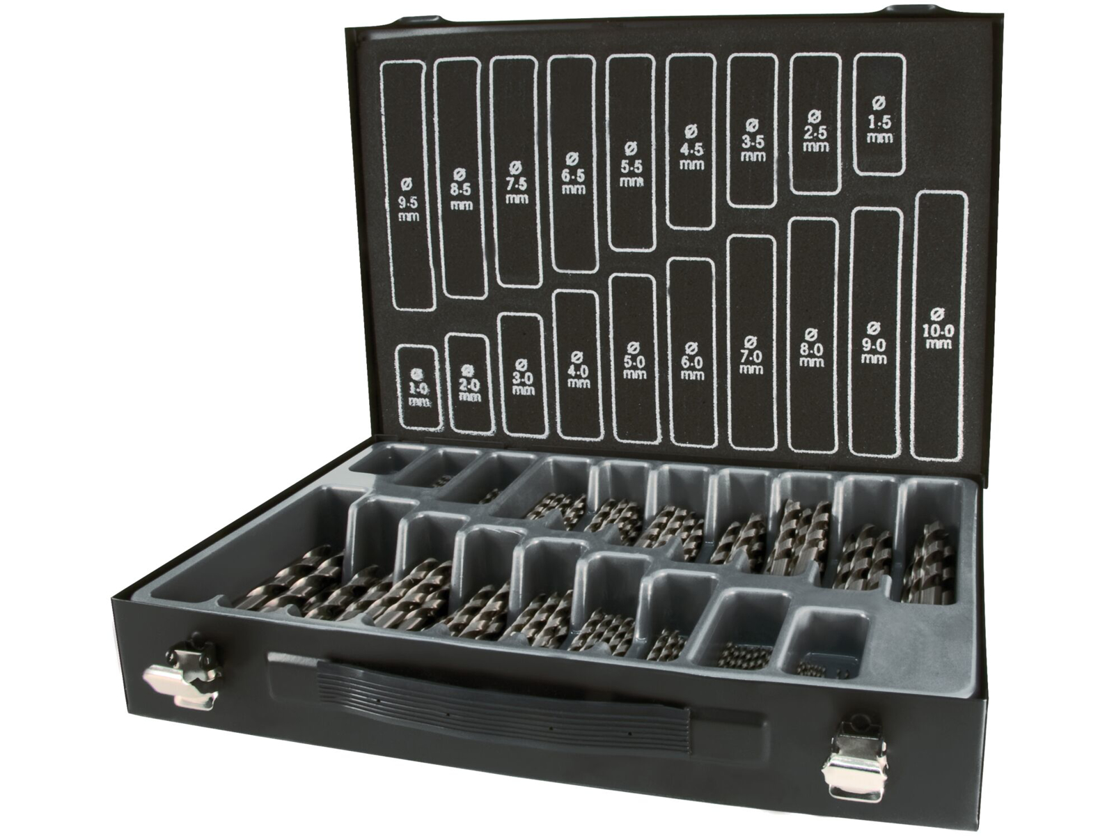 Borkuffert med 170 slebne spiralbor DIN338 HSS-G 1-10×0,5 mm. Indeholder 10 stk 1-8 mm samt 5 stk 8,5-10 mm. Til anvendelse i stål, stålgods legeret og ulegeret op til 900 N/mm² styrke. Grå-, temper-, sejjern- og trykgods, sinterjern, nysølv, grafit, kortspåntagende aluminiumslegeringer, messing og bronze.