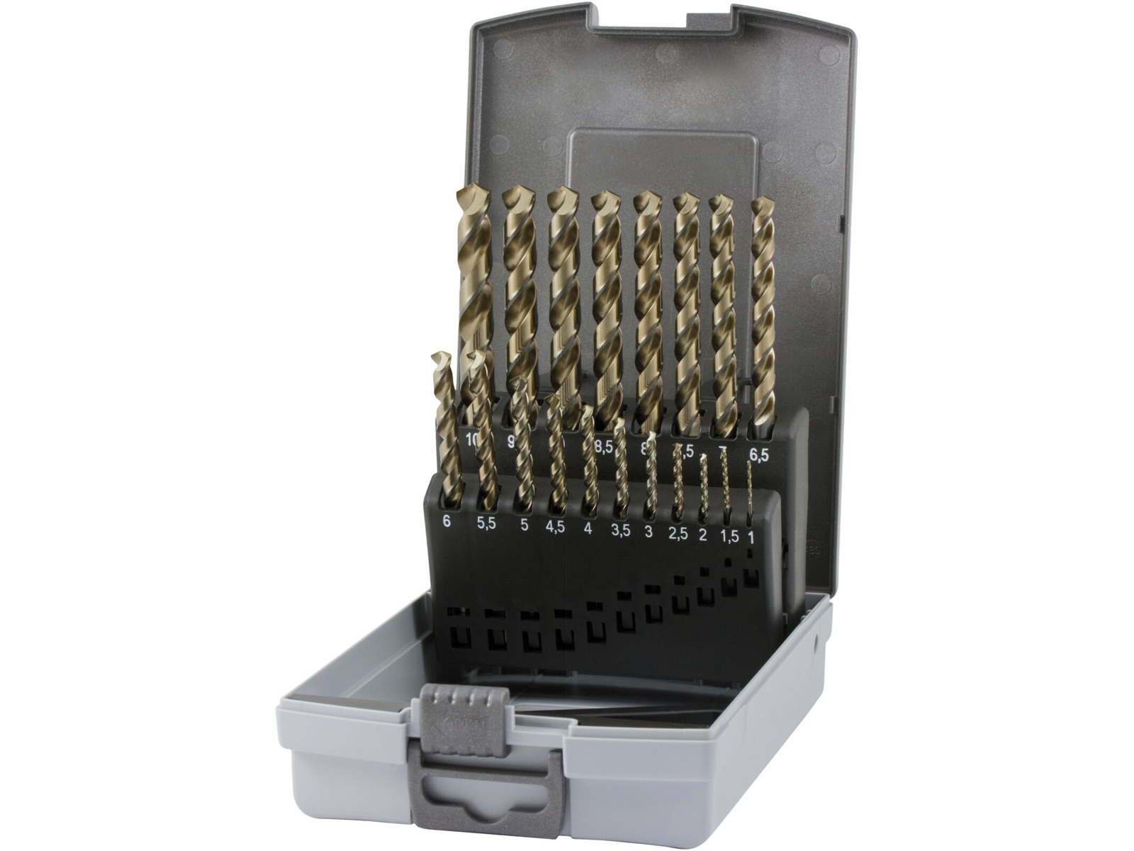 Borsæt DIN338 HSS Co5 UNI 1-10×0,5 mm i kunststofkassette. Effektivt spiralbor udviklet specielt til anvendelse i håndboremaskiner og akku-skruemaskiner (bedste effekt ved 5,0 mm godstykkelse). Skaftet med 3 spændeflader sikrer en god fiksering i borepatronen og er let at sætte i. Desuden sikre skaftet en optimal overføring af kraften. Boret kommer ikke til at spinne. Det effektive skær på 135° sikre en meget stor centreringsnøjagtighed, især når maskinen føres med hånden. Skæret forhindrer at boret glider ved borestart på buede overflader. Den sorte fas øger slidstyrken og forhindrer koldsvejsninger og spånophobning. Anvendes til stål op til 1100 N/mm², rustfri stål, alu, messing, bronze, plast og støbejern.