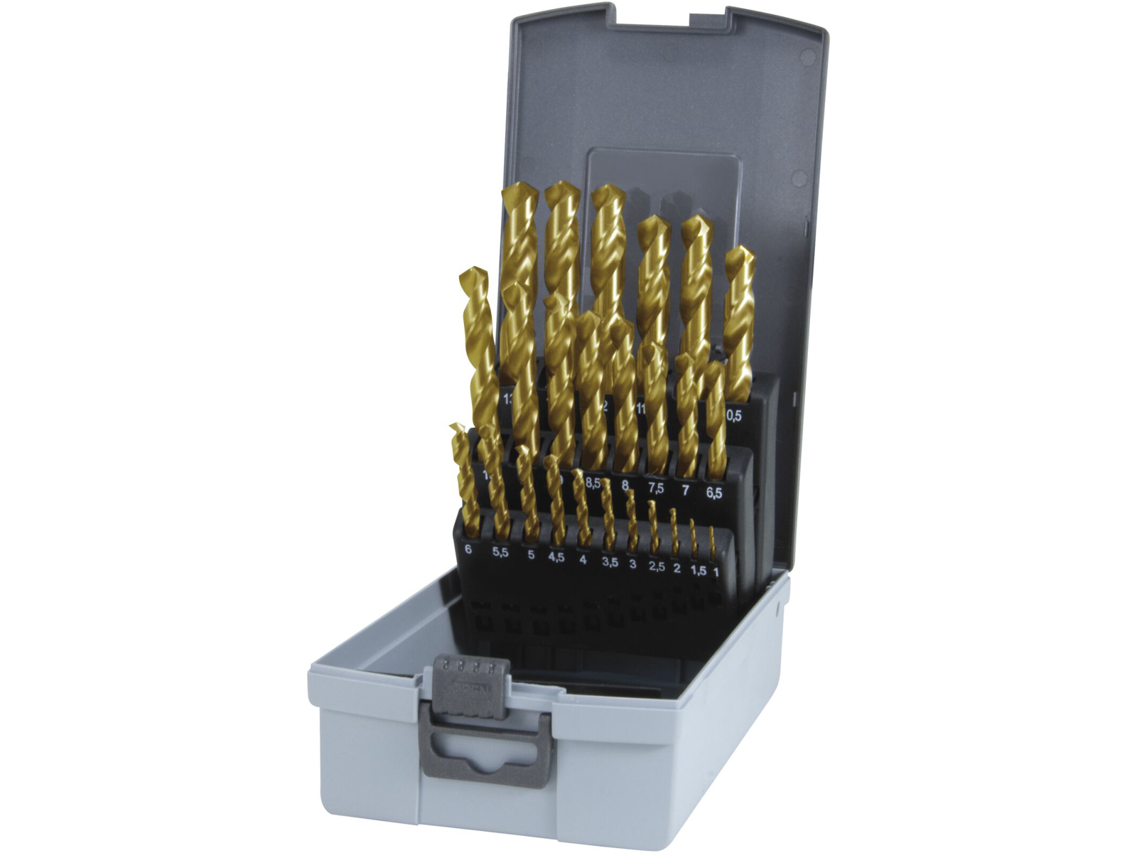 Borsæt DIN338 HSS-G TiN 1-13×0,5 mm i kunststofkassette. Overflade TIN=Titan-Nitrid. På grund af TiN belægningen forøger overfladehårdheden sig til ca 2.300 HV og varmebestandigheden til ca 600°C. Opnåelsen af højere standtider ved forøgende skærehastigheder. Anvendes til stål, stålgods legeret og ulegeret op til 1100 N/mm², grå-, temper-, sejjern- og trykgods, sinterjern, nysølv, grafit, kortspåntagende aluminiumslegeringer, messing og bronze.