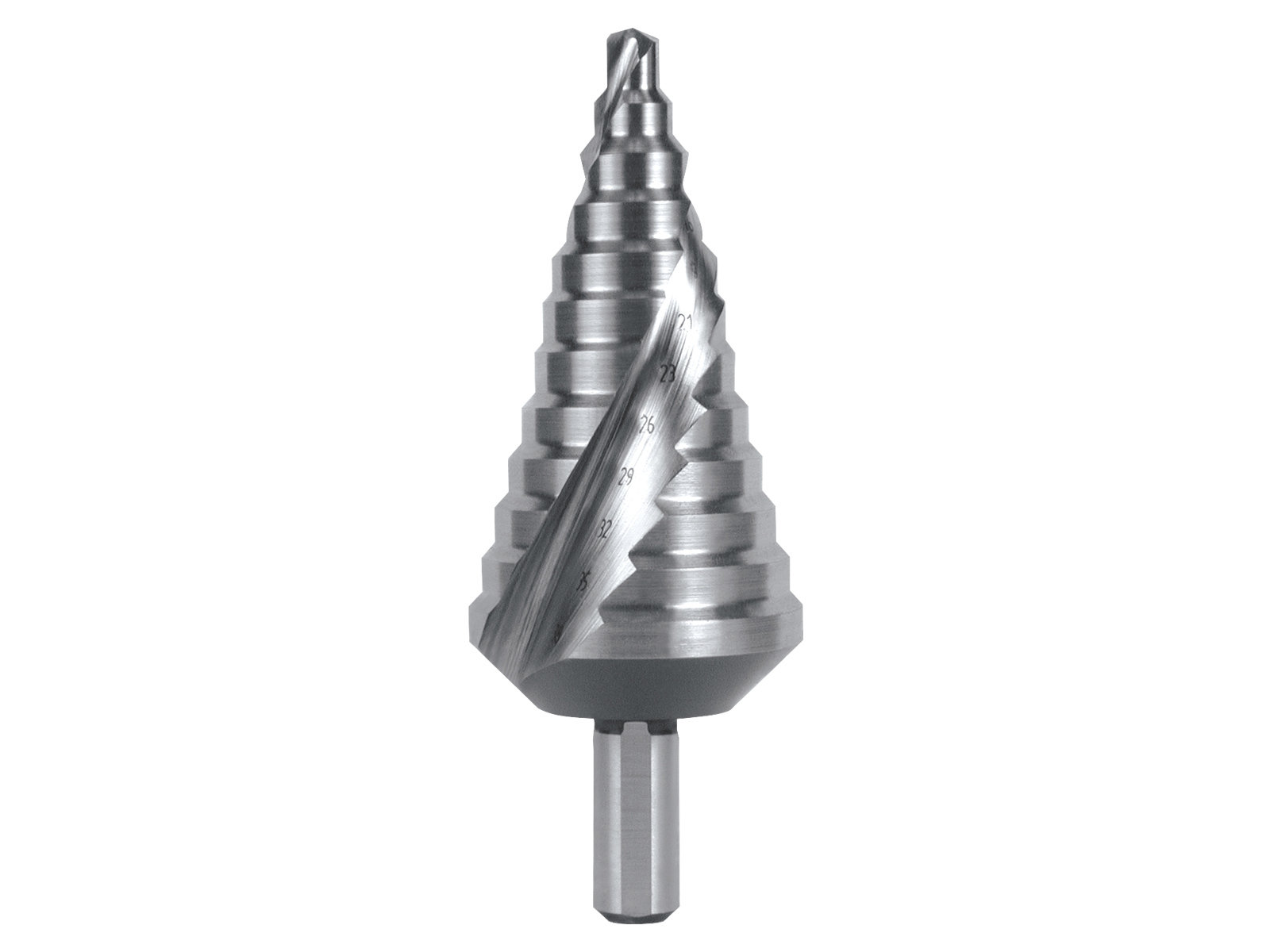 Trappebor HSS 6-38 mm. Den dybslebet og spiralsnoet spånkanal giver et helt roligt løb og samtidig en meget stor skærekapacitet. Især ikke brækkende spåner transporteres meget let væk, akkurat som på et spiralbor. Dette formindsker samtidig at affald og koldsvejsninger sætter sig på skæret. Konusen for enden af trinboret letter tilbagetrækningen ved gennemboring af pladen. Anvendes til stål, støbegods, NE- og letmetaller.