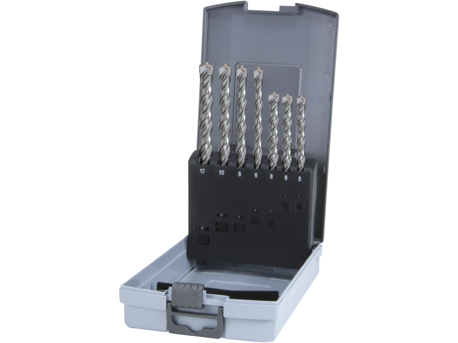 SDS-plus hammerborsæt i kunststofkassette. Indhold SDS-plus hammerbor 2-skærs. Ø5,0-6,0-8,0×110 mm og Ø6,0-8,0-10,0-12,0×160 mm. Meget høj stabilitet som gennem kerneforstærkning giver maximal kraftoverførelse fra borhammer til borspids. Stor slidstyrke på grund af speciel behandling af stålet. Spiral for optimal boremelstransport. Særdeles velegnet til befæstigelsesarbejde. Hammerfast hårdmetalplatte af speciallegering. Anvendes til granit, beton, klinker, murværk, fliser og marmor. Kan bruges i alle maskiner med SDS-plus holder eller 2-spor-holder som f.eks. Hilti TE 10-22.