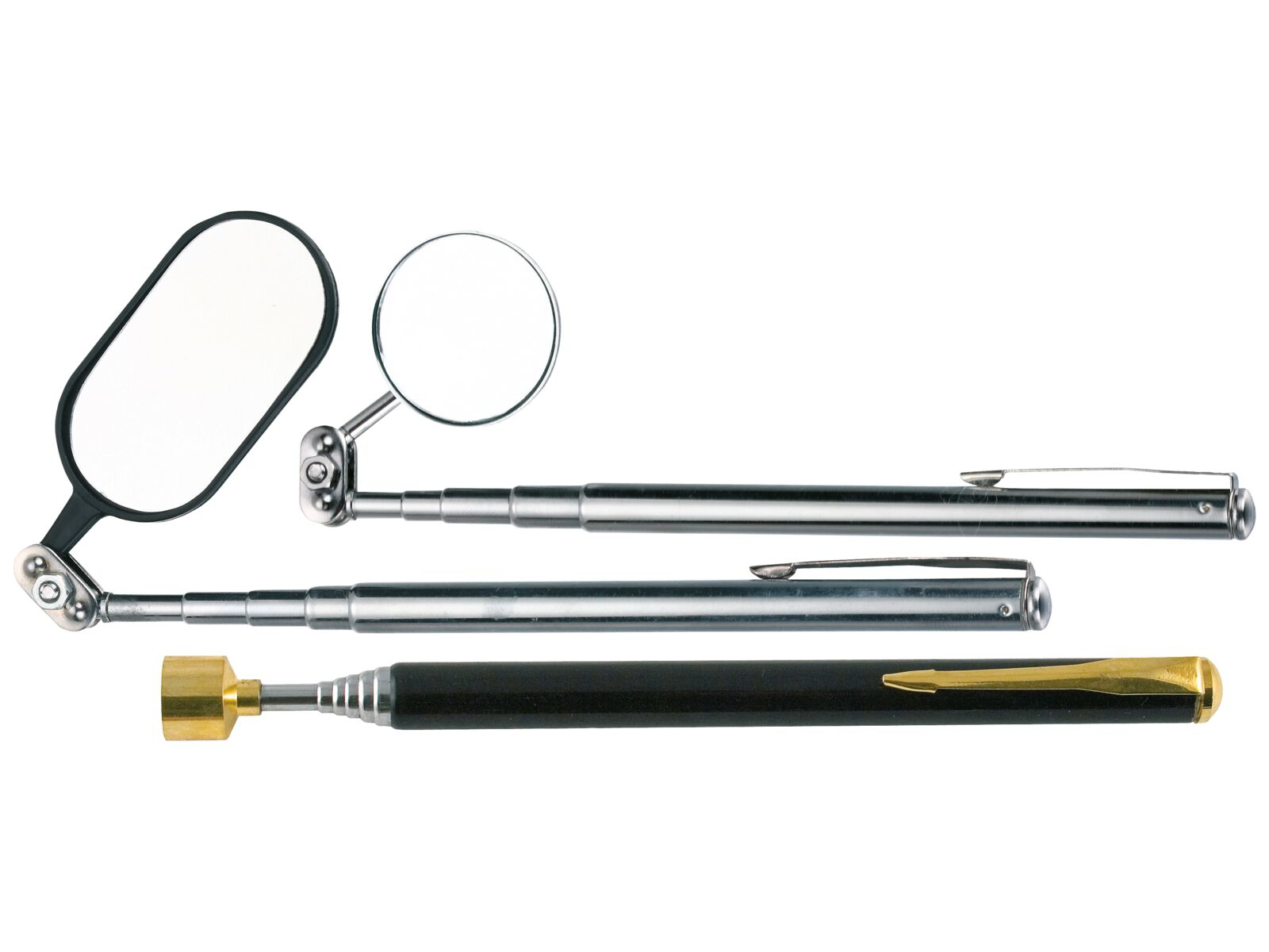 Inspektionsspejle med teleskopskaft for øget arbejdslængde, praktisk pen-type m. lomme clips. Kraftfuld teleskop magnet med lomme-clips, praktisk til opsamling af magnetiske genstande som f.eks bolte og møtrikker på ufremkommelige steder.