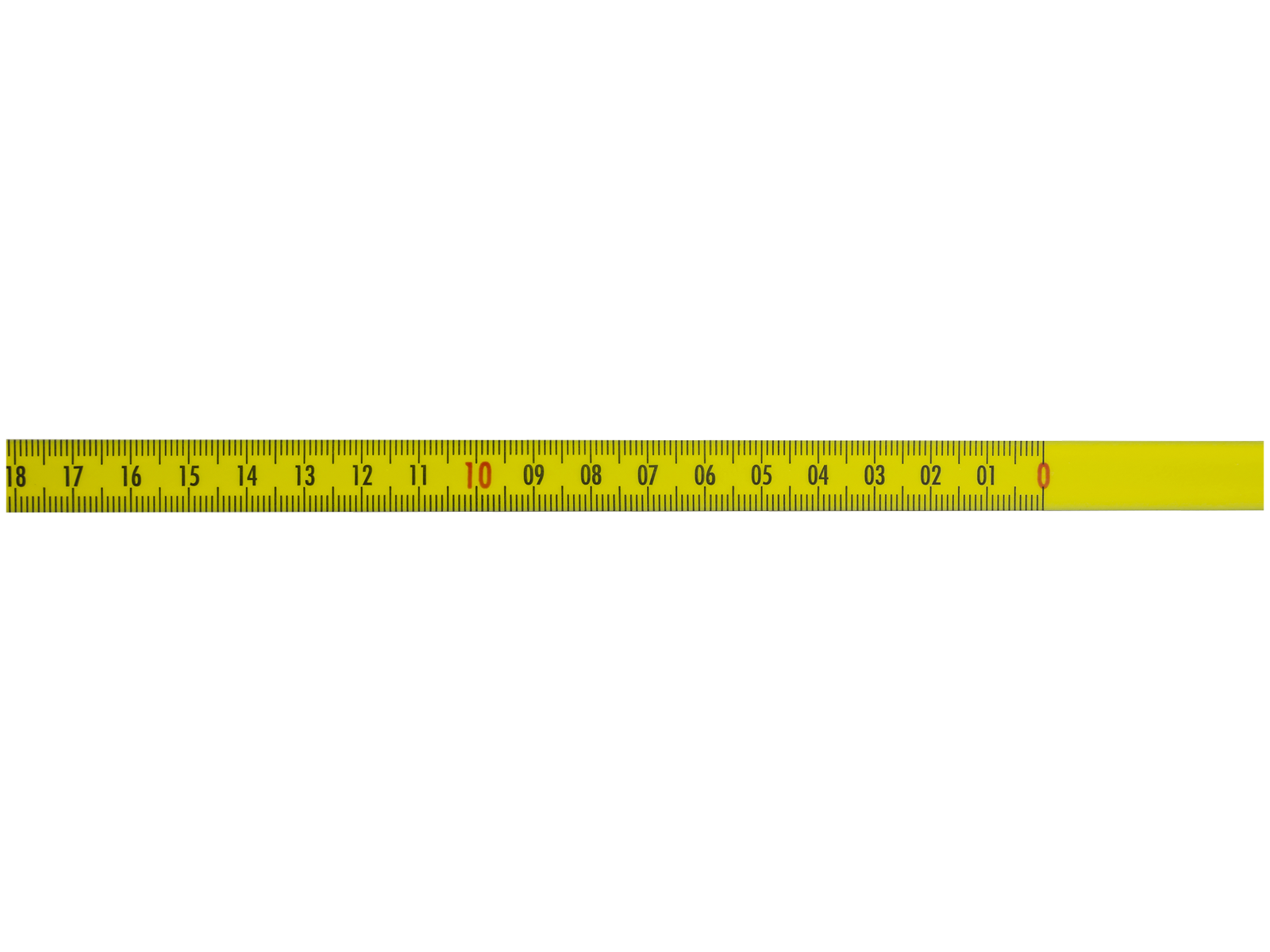Selvklæbende målebånd i stål med dobbeltsidet klæbebånd. Kontinuerlig gradering af mm og cm. Sort graduering i top og bund. Løbende cm mærket med sorte tal. Løbende meter mærket med røde tal. Båndbredde 13 mm (enkelte varianter 10 mm). Fås i flere længder samt højre-venstre eller venstre-højre graduering.