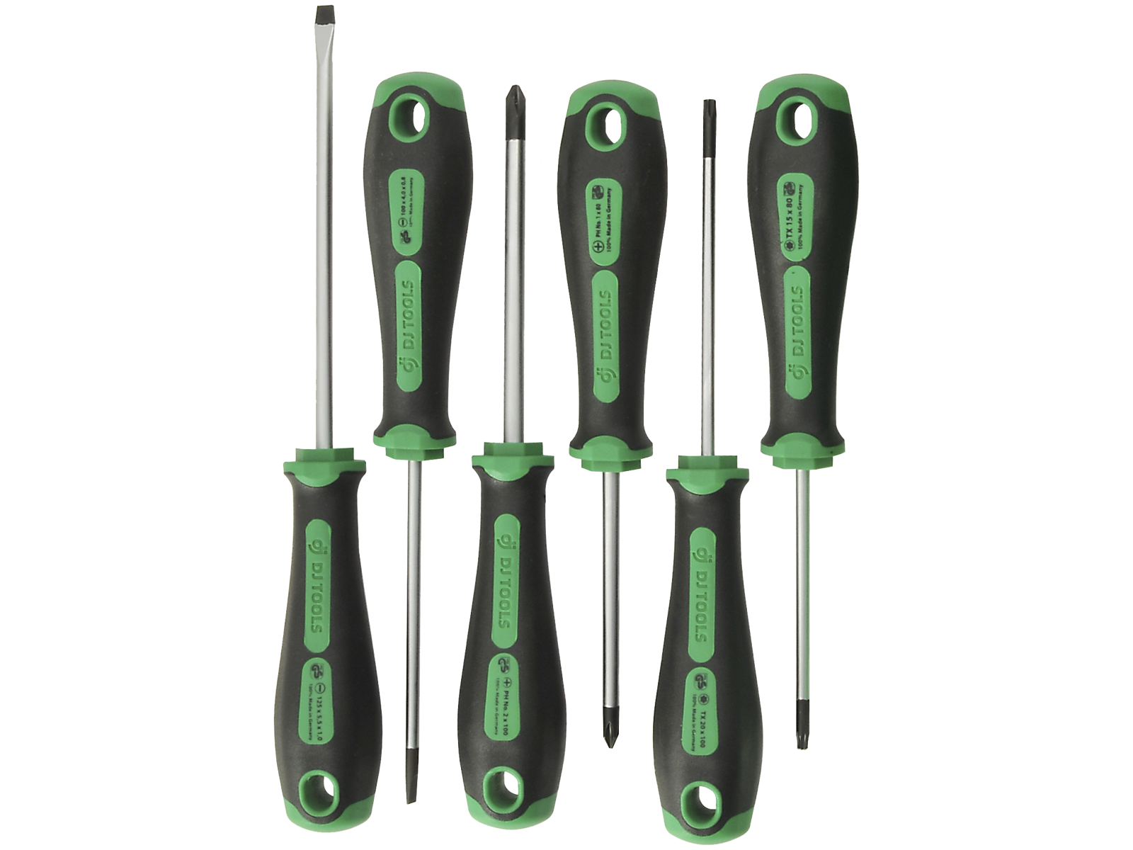 Skruetrækkersæt med 6 dele: lige-, Philips- og Torx-kærv. Indhold: 4,0 mm og 5,5 mm - PH1 og PH2 - TX15 og TX20.