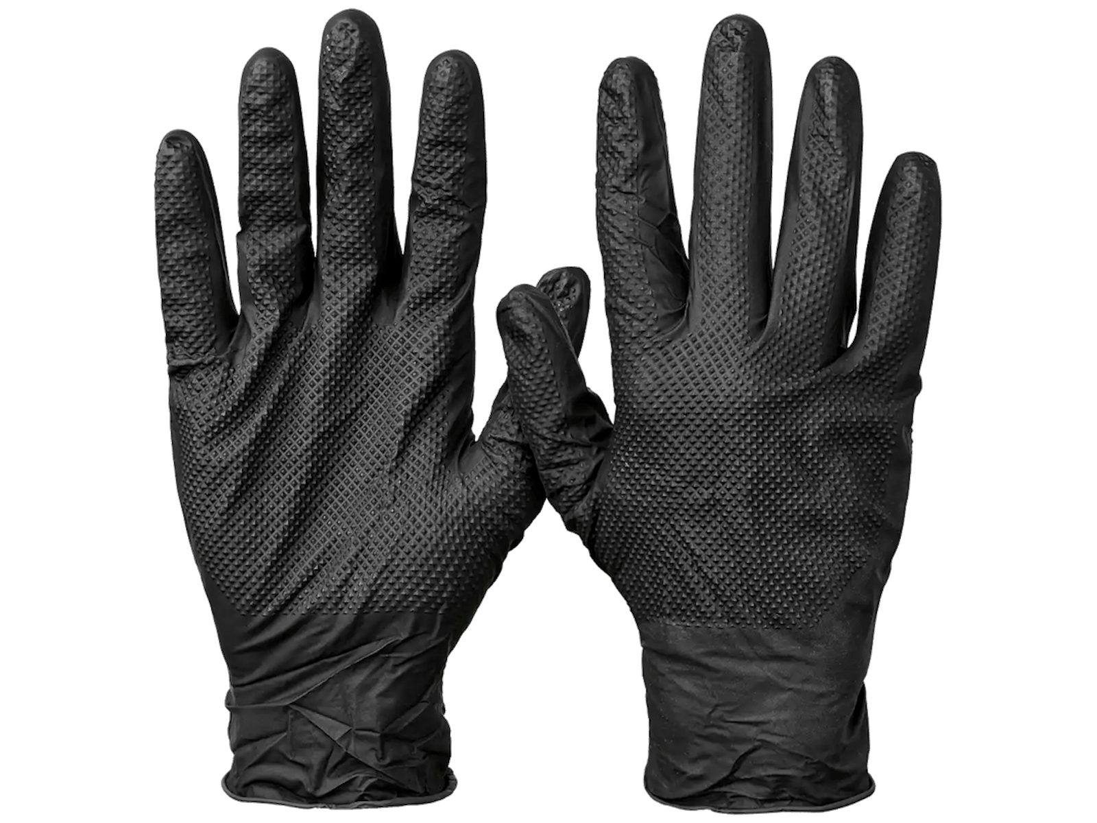 • Nilex Diamond Black pudderfri nitrilhandske med ru diamantmønster og rullet kant. Tykkelse i håndflade 0,22 mm. Tykkelse i fingerspidser 0,25 mm. Længde 24,5 cm. Kategori III. AQL. EN ISO 21420:2020, EN ISO 374-1:2016+A1:2018/Type B, EN ISO 374-4:2019, EN ISO 374-5:2016, Migrationstestet EN 1186-1:2002.