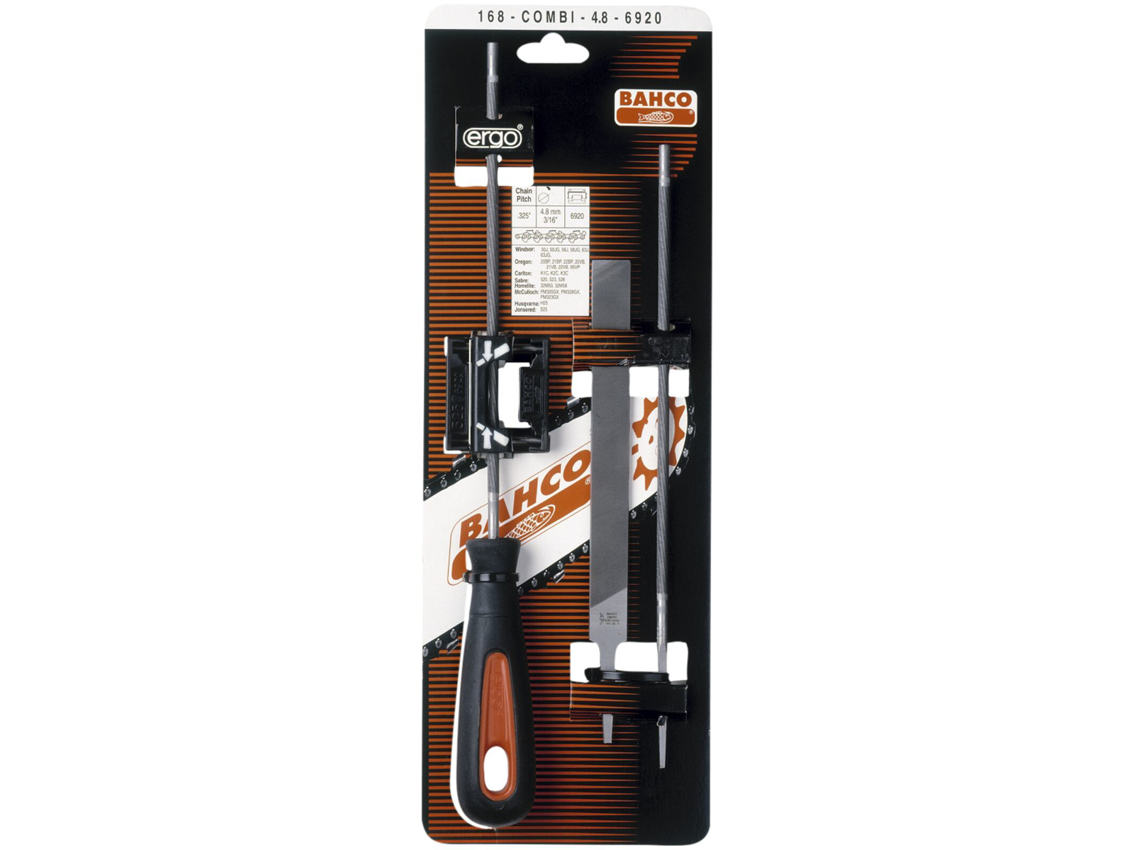 Filehæfte udviklet i henhold til Bahcos ERGO™ program. Sæt bestående af 2 stk. runde kædesavfile. Desuden 1 stk. 6" flad kædesavfil. Sættet indeholder filelære, som sikrer korrekt filing af såvel skæreled som ryttere på motorsavkæder