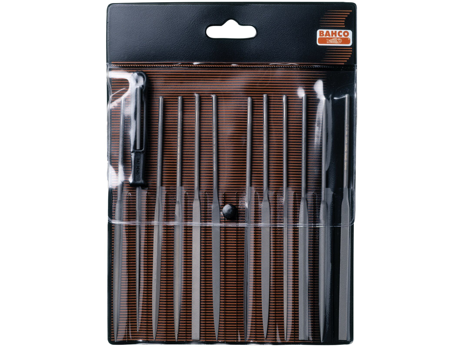 For finfiling og polering. Fortrinsvis ved gravørarbejde, finmekanik, instrument-, guldsmede- og urmagerarbejde. I alt 12 stk. i plastmappe. Bestående af 1 stk. af hver af typerne: ansats, flad, trekant, firkant, halvrund, mærke, fugletunge, rund, kniv, baret, dobbelt trekant og rundkantet. 1 stk. nålefilehæfte type 9-488-02-10.