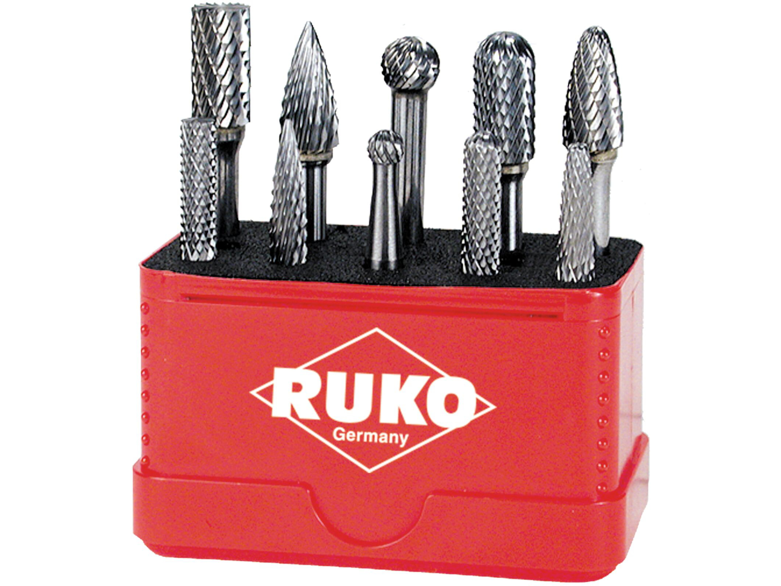 Sæt med 10 stk hårdmetal fræsestifter i mini-plastikboks. Indeholder 1 stk af hver i Ø 6 mm + Ø 12 mm, form A cylindrisk med endeskær (ZYA), form C med afrundet top (WRC), form G med spids (SPG), form F med afrundet top (RBF), form D med kugle (KUD).