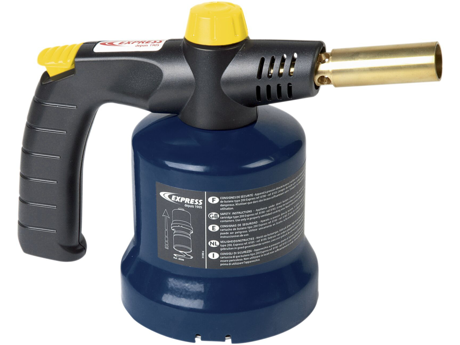 Express blæselampe med piezotænding i håndtaget. Kan vendes med bunden i vejret uden at den flammer op pga. en indbygget forsinkelse på 5 sek. Varmer op til 1850° og er udstyret med en metalbund.