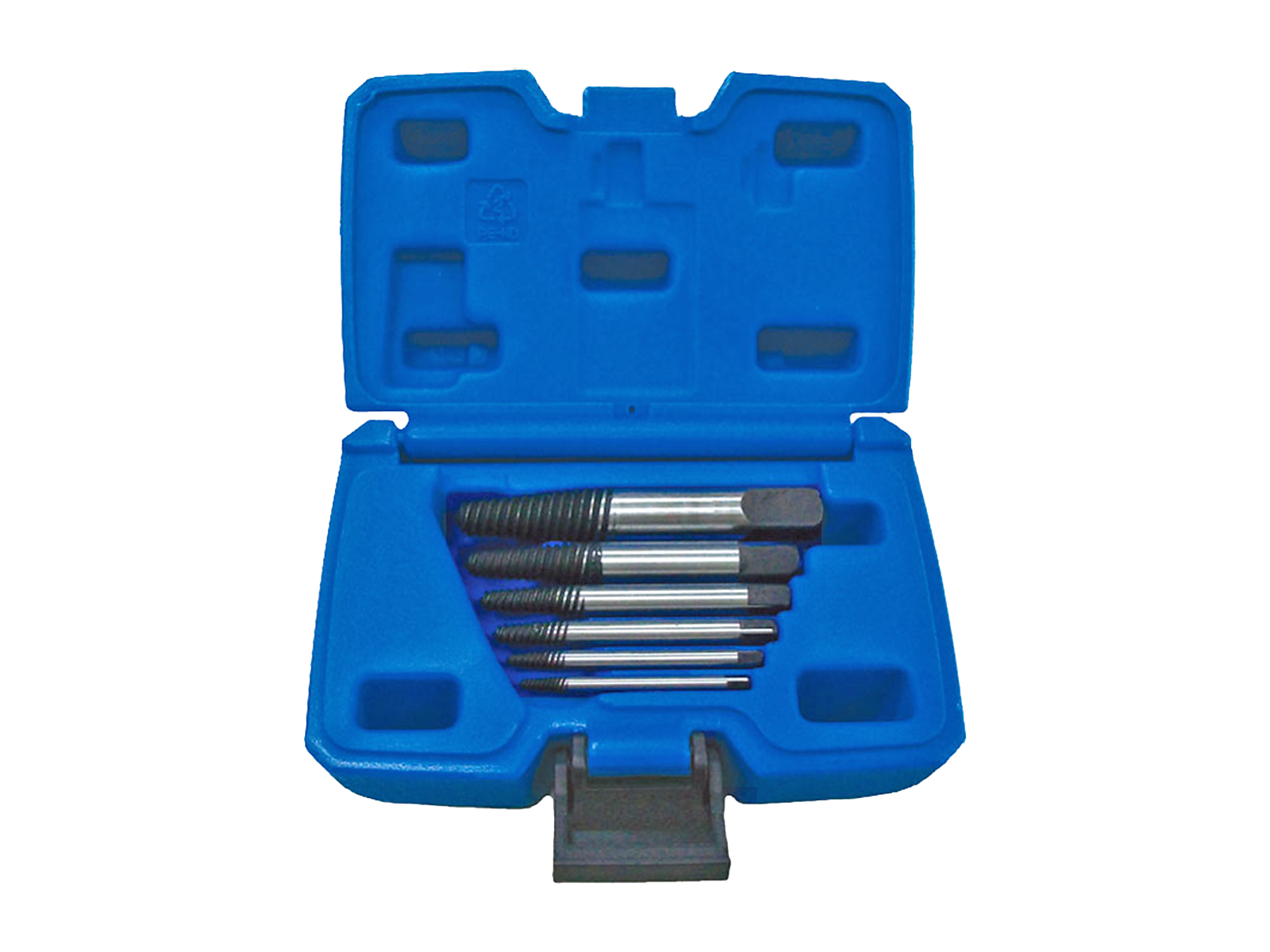 Skrueudtrækkersæt med 6 dele. Indeholder: M3-M4 (1/8"-3/4"), M5-M7 (3/16"-1/4"), M8 (5/16"), M10-M12 (3/8"-7/16"), M14-M16 (1/2"-9/16") og M18-M22 (5/8"-3/4"). Leveres i plastkuffert.