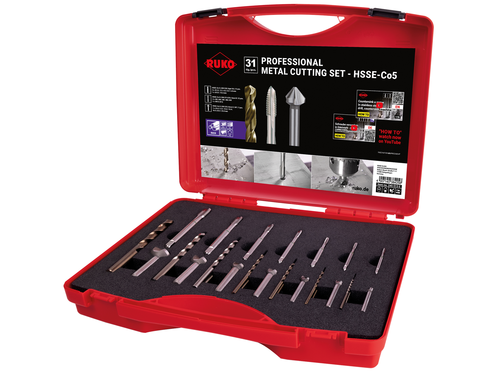 Kuffert med værktøj fra M3 ti lM12. HSS Co5 til brug i bl.a. rustfrit stål. Indhold: 2 stk. spiralbor DIN 338 ø2,5/3,3/4,2/5,0/6,8 mm - 1 stk. 8,5/10,2 mm - 2 stk. maskintappe M3/4/5/6/8 - 1 stk. M10/12 - 1 stk. forsænker 6,3/8,3/10,4/12,4/16,5/20,5/25,0 mm.