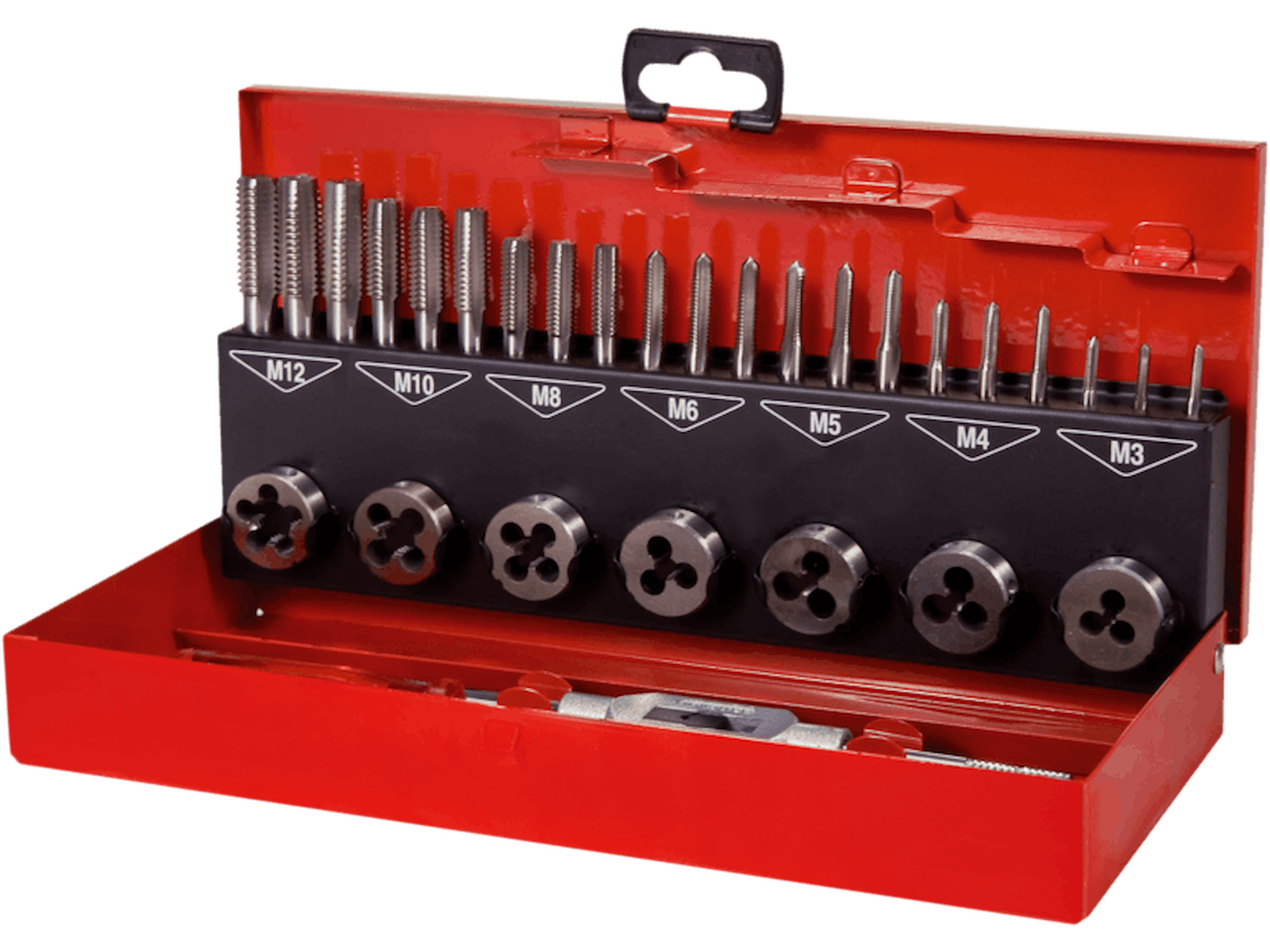 Gevindværktøjssæt med 31 dele. Velegnet til aluminium, messing, plastik og stål (N/mm2) < 800. Kan også bruges til bronze og støbejern. Leveres i praktisk og robust opbevaringskasse af metal.