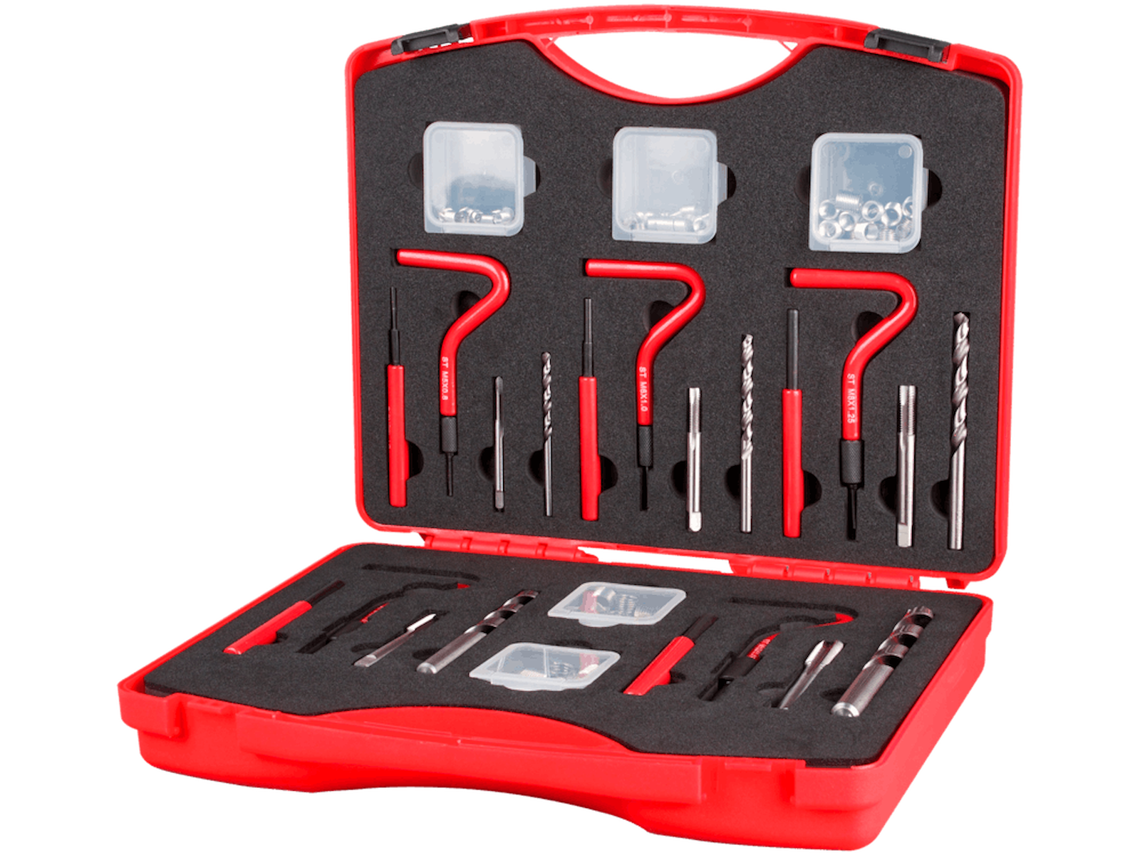ProCoil gevindreparationssæt med: 5 stk. spiralbor HSS ø5,2 / 6,2 / 8,3 / 10,3 / 12,4 mm, 5 stk. håndsnittappe DIN 352 HSS M5 / M6 / M8 / M10 / M12, 5 stk. indbygningværktøj M5 / M6 / M8 / M10 / M12, 5 stk. tapbrydere ø3,5 / 4,8 / 6,0 / 7,5 / 9,5 mm, samt gevindindsatse: 5 stk. pr. dimension (M5-M10) og 2 stk. pr. dimension (M12). Leveres i praktisk kuffert.