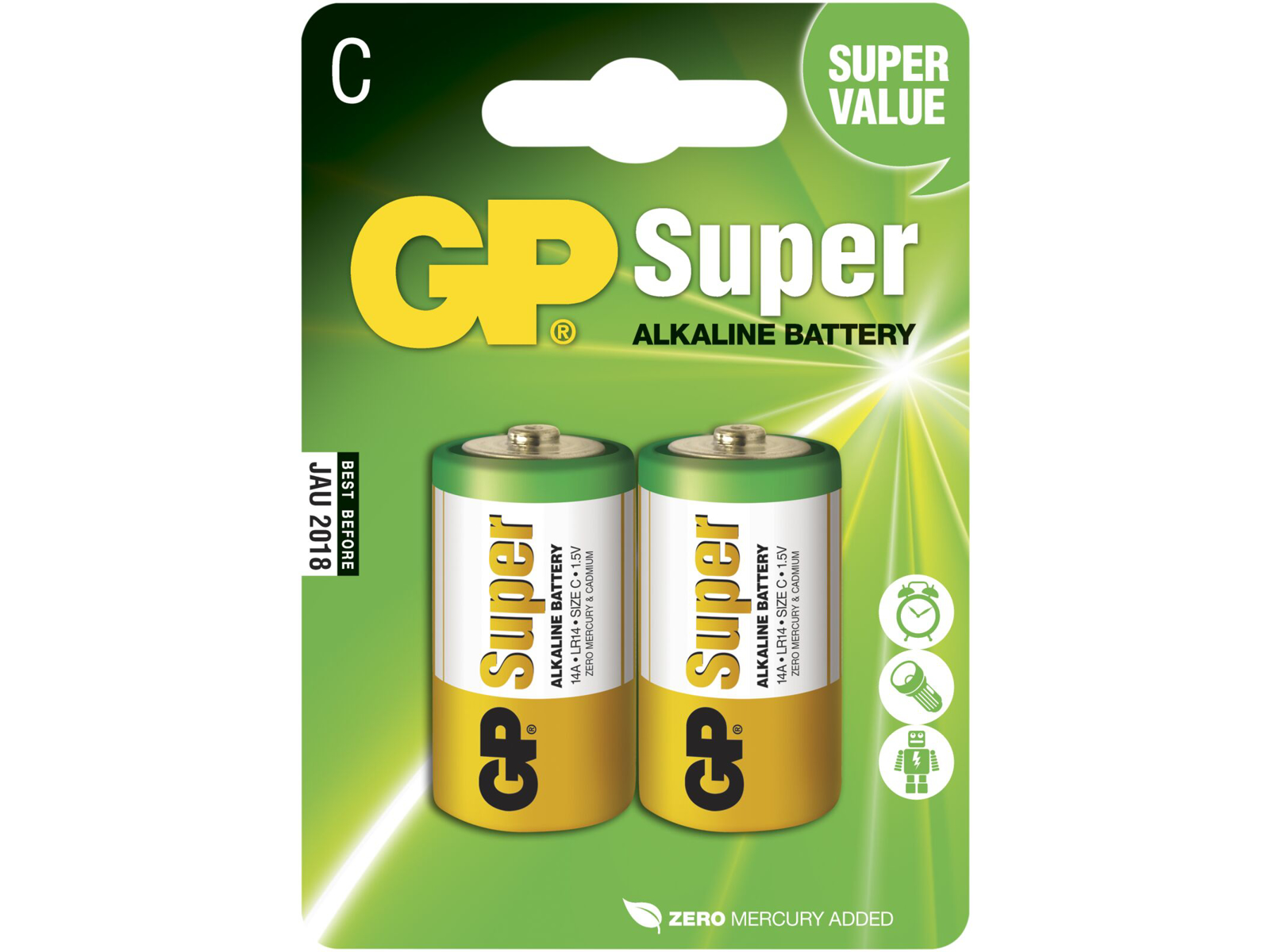 GP Super Alkaline LR14/C 1,5V. Blisterkort med 2 batterier