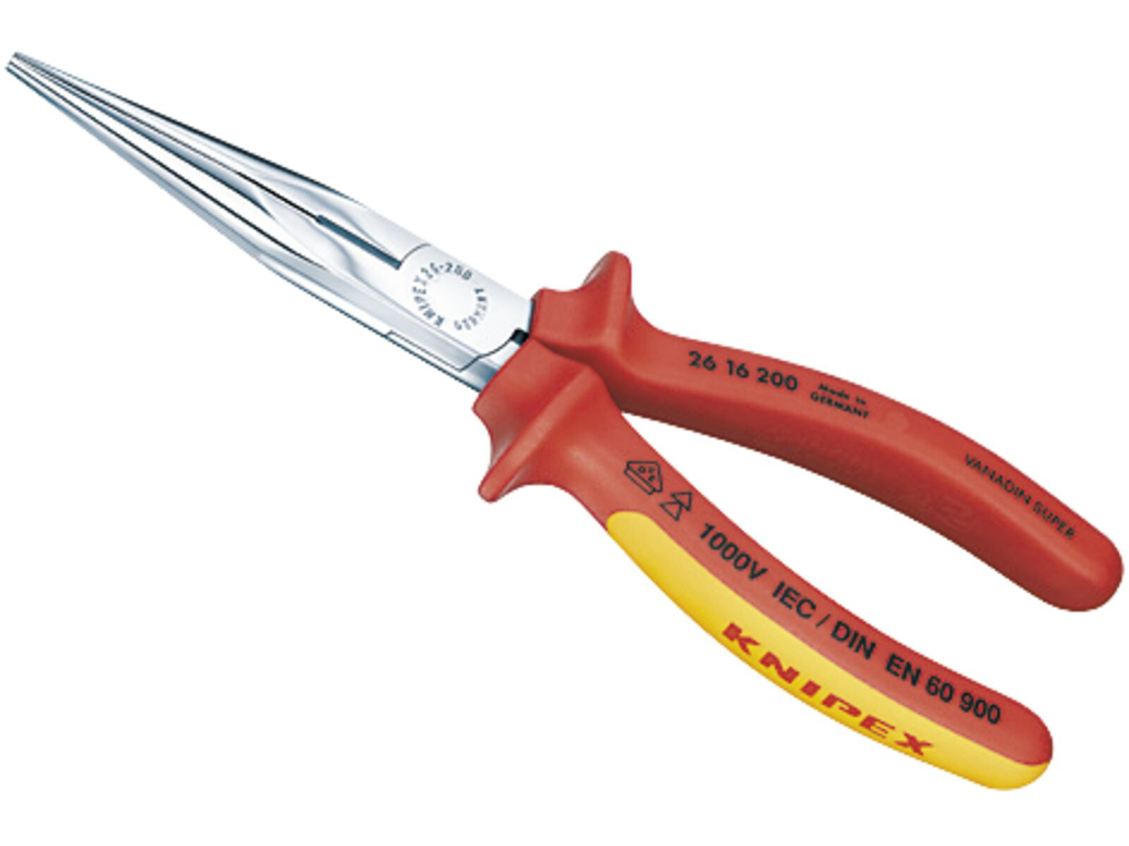 Fladrundtang med skær forkromet 200 mm. Meget belastbare, elastiske præcisionsspidser. Flad-runde, lange kæber. Fortandede gribeflader. Med skær til mellemhård tråd Ø3,2 mm og hård tråd Ø2,2 mm. Skær yderligere induktivt hærdede, skærhårdhed ca. 61 HRC. Vanadium- elektrostål- smedet, oliehærdet.