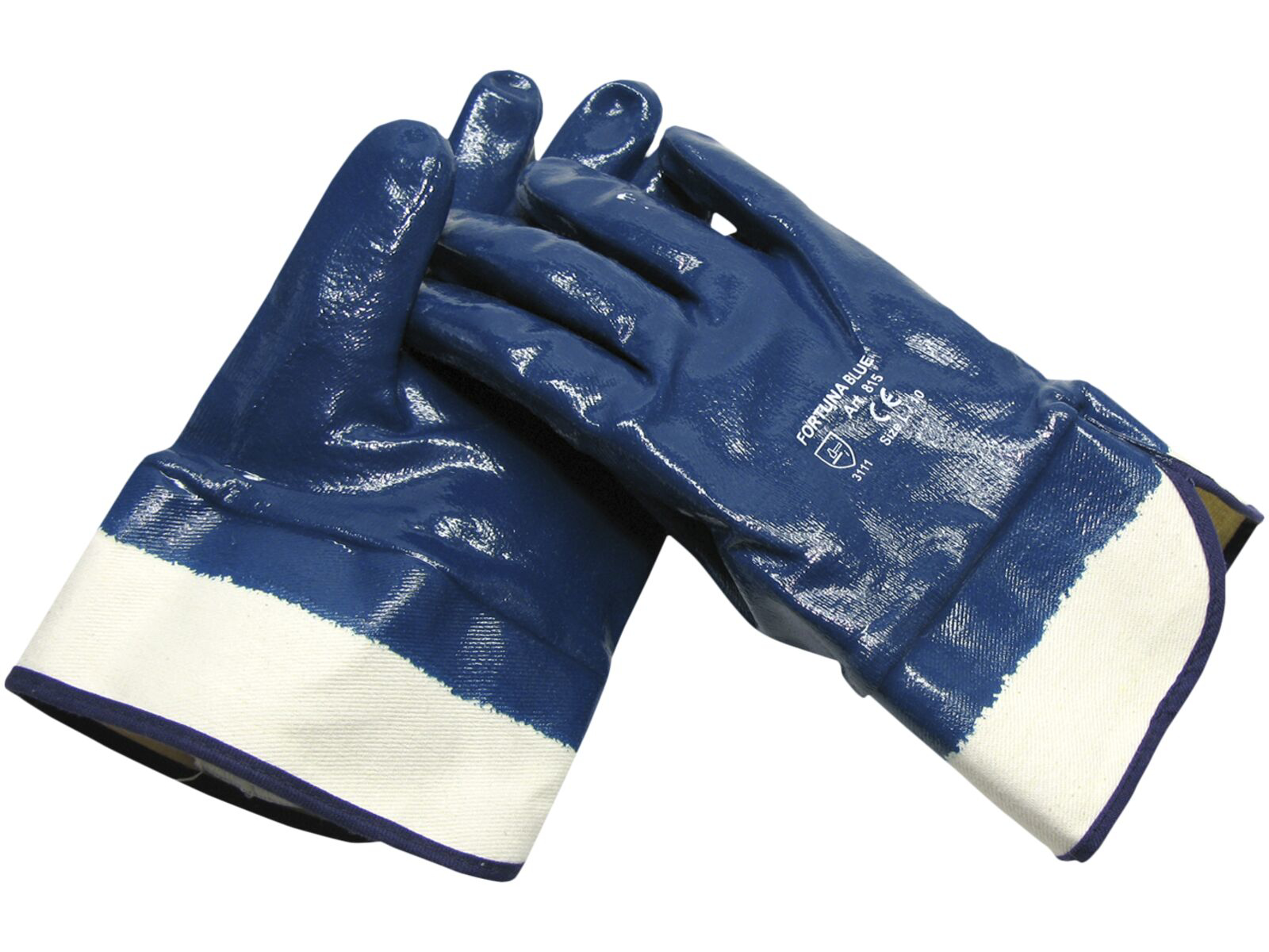 Blå nitril heldyphandske med krave og fór af bomuldsjersey. Tykkelse 1,1 mm. Kategori II kategori testet iht. EN420, EN388.
