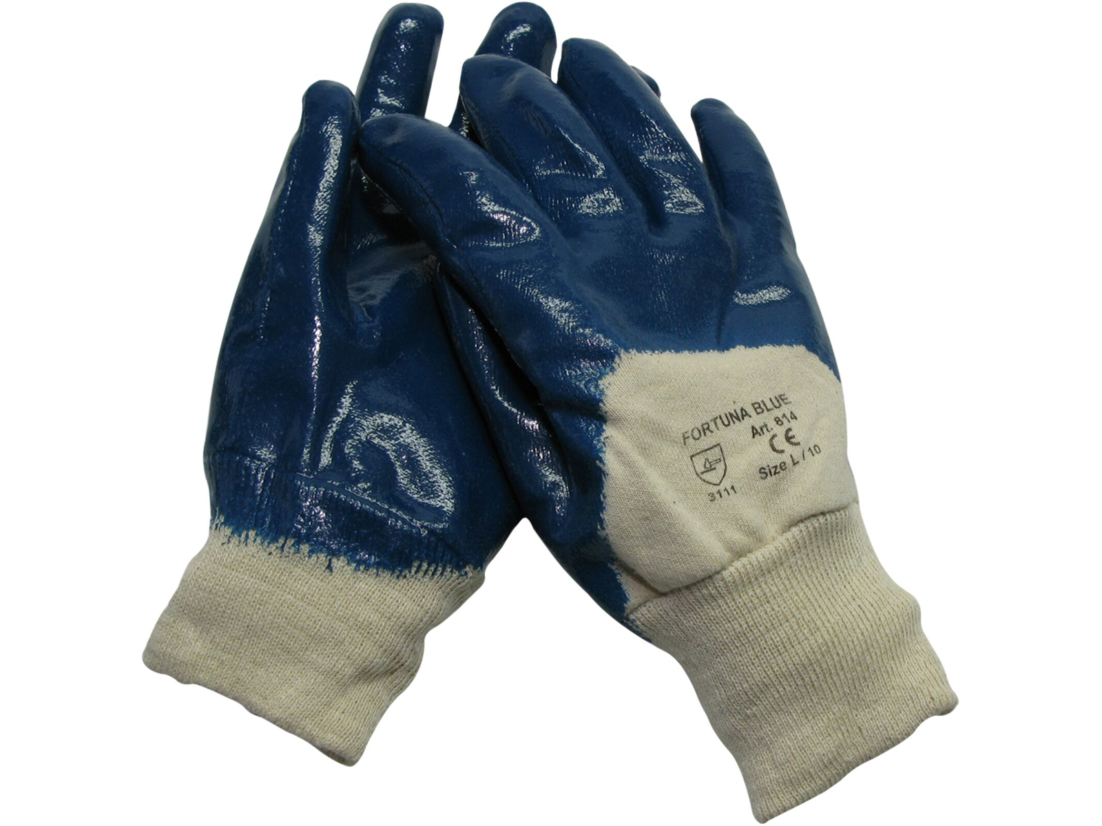 Blå nitril halvdyphandske med håndflade af glat nitril, fór af bomuldsjersey og ribkrave. Tykkelse 1,1 mm. Kategori II kategori testet iht. EN420, EN388.