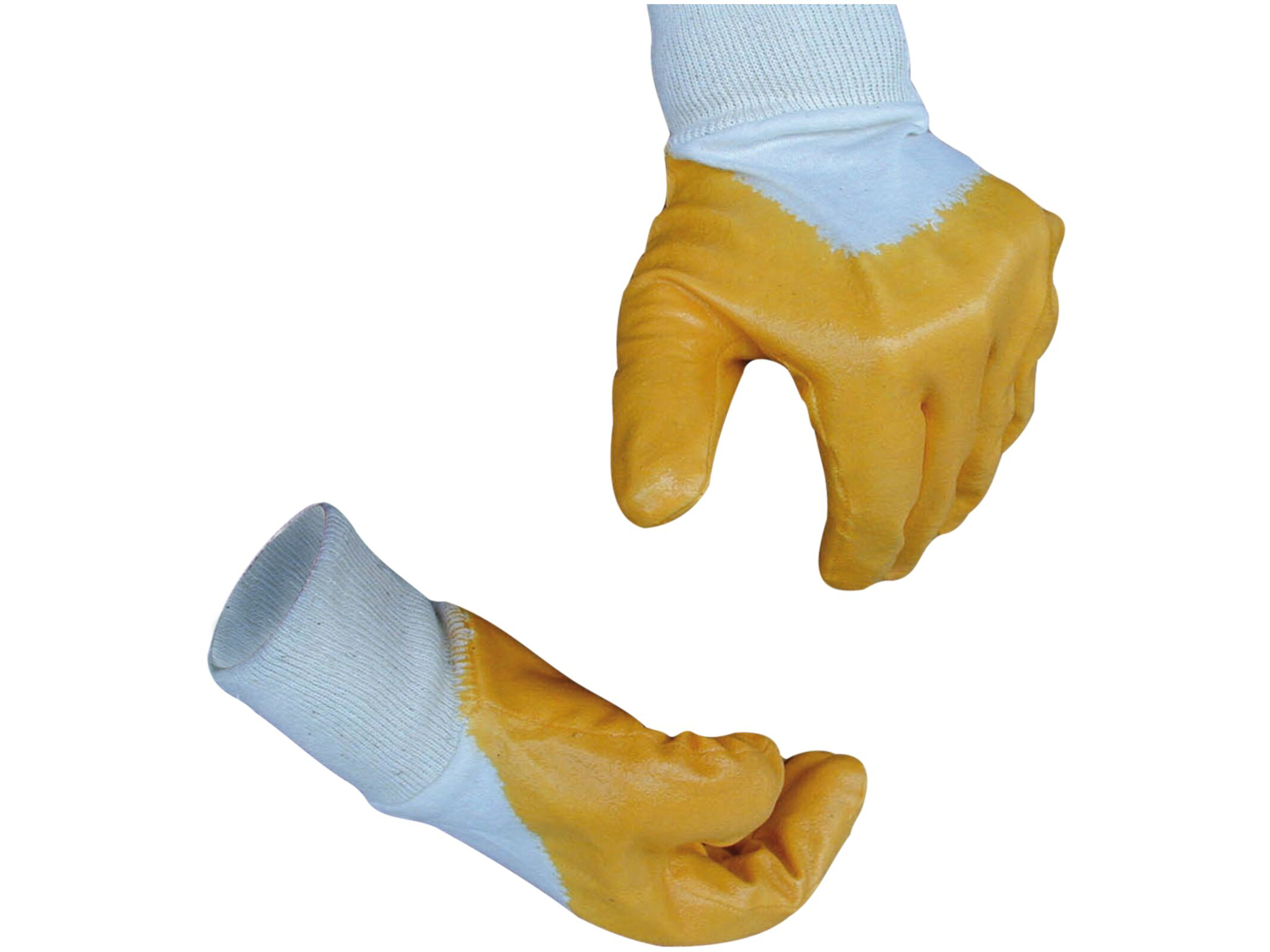 Nitril 3/4-dyphandske med fór af bomuldsjersey og ribkrave. Ru overflade. Kategori II handske testet iht. EN420, EN388. Er ikke 100% væsketæt. Entreprenørarbejde, beton-, træ- og metalindustri.