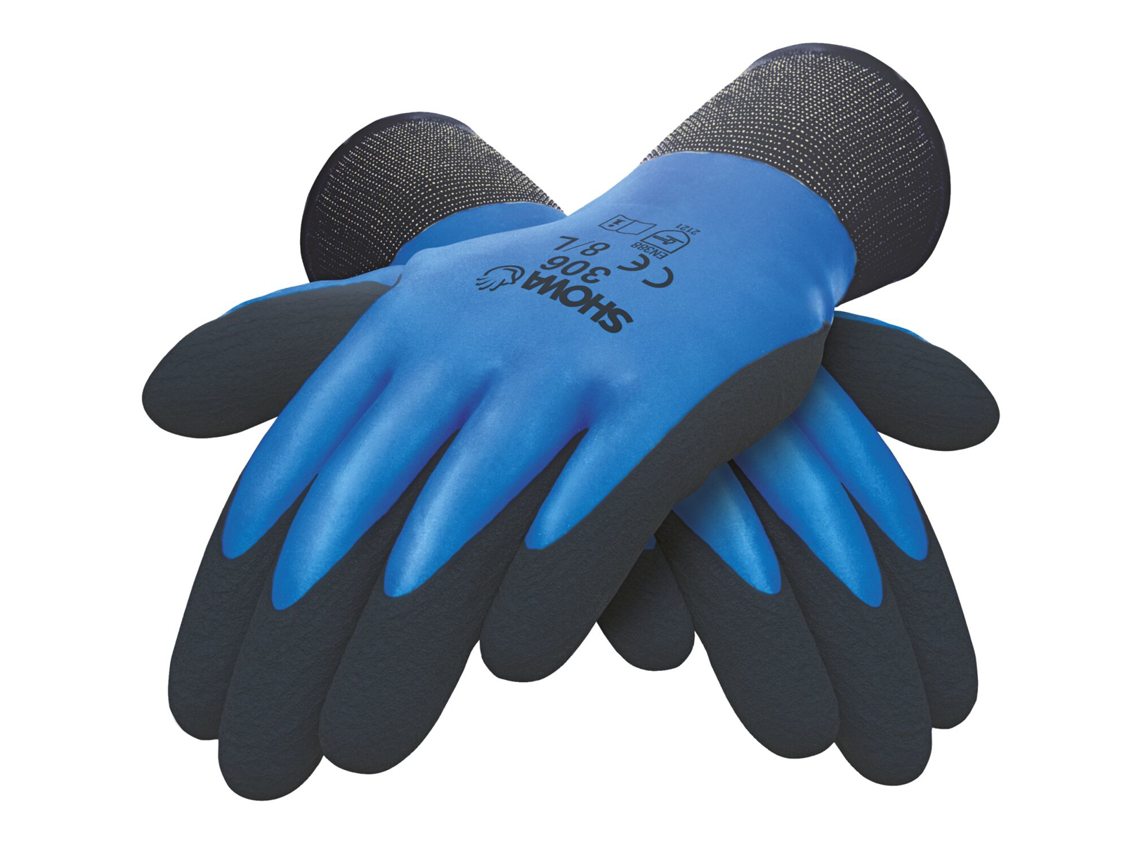 Polyester/nylon med latex foambelægning, dobbelt. Anvendes til lagerarbejde, landbrug, byggeri, både tørre, våde, varme og kolde betingelser. Belægningen er uigennemtrængelig for vand samt åndbar. Heldyppet med blå latex og 1/2-dyppet med sort foam latex.