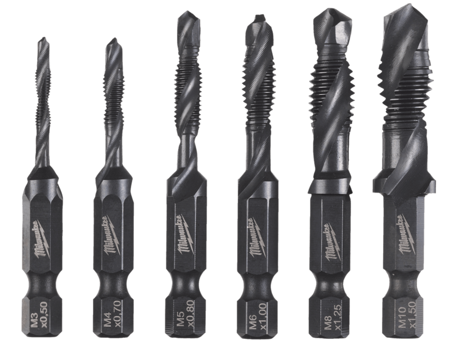 3-i-1 kombinationstappe til boring, gevindskæring og afgratning i plast, pladestål og ulegerede materialer op til 800 N/mm². Velegnet til brug med batteri- eller ledningsdrevne værktøjer - egnet til brug til batteridrevne slagboremaskiner, når den anbefalede borehastighed overholdes. 1/4" hex fæste. Sættet inkluderer: M3, M4, M5, M6, M8 og M10. NB, brug altid en velegnet skæreolie.