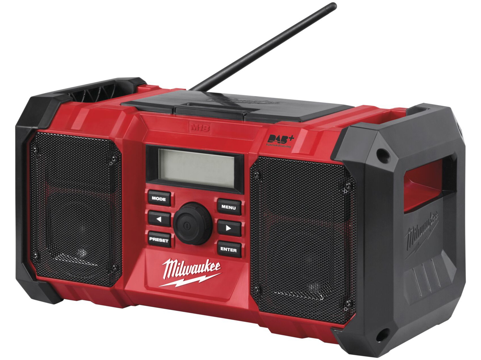 Leveres med AUX-kabel, 2 x AAA batterier. Uden M18 batterier