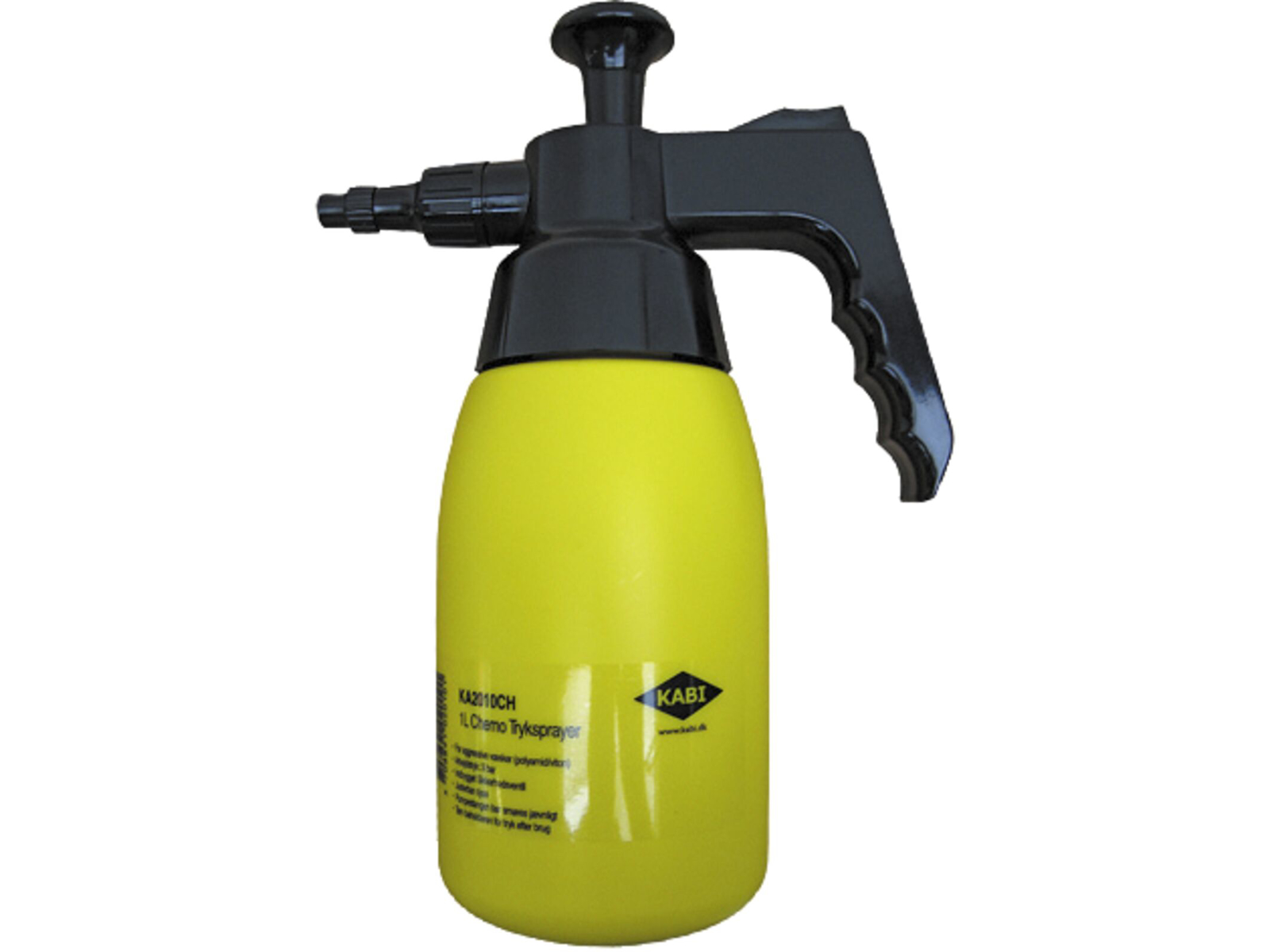 KABI Chemo tryk-sprayer 1,0 ltr. Velegnet til forstøvning af aggressive væsker, dog ikke sprit- og acetoneholdige produkter. Specielt velegnet til oliebaserede væsker. Man skal dog altid sikre sig at sprayeren ikke beskadiges af det anvendte produkt. Er forsynet med justerbar dyse. Pumpe af polyamid. Pakning af Viton. Arbejdstryk 3 bar. Indhold 1,0 liter.