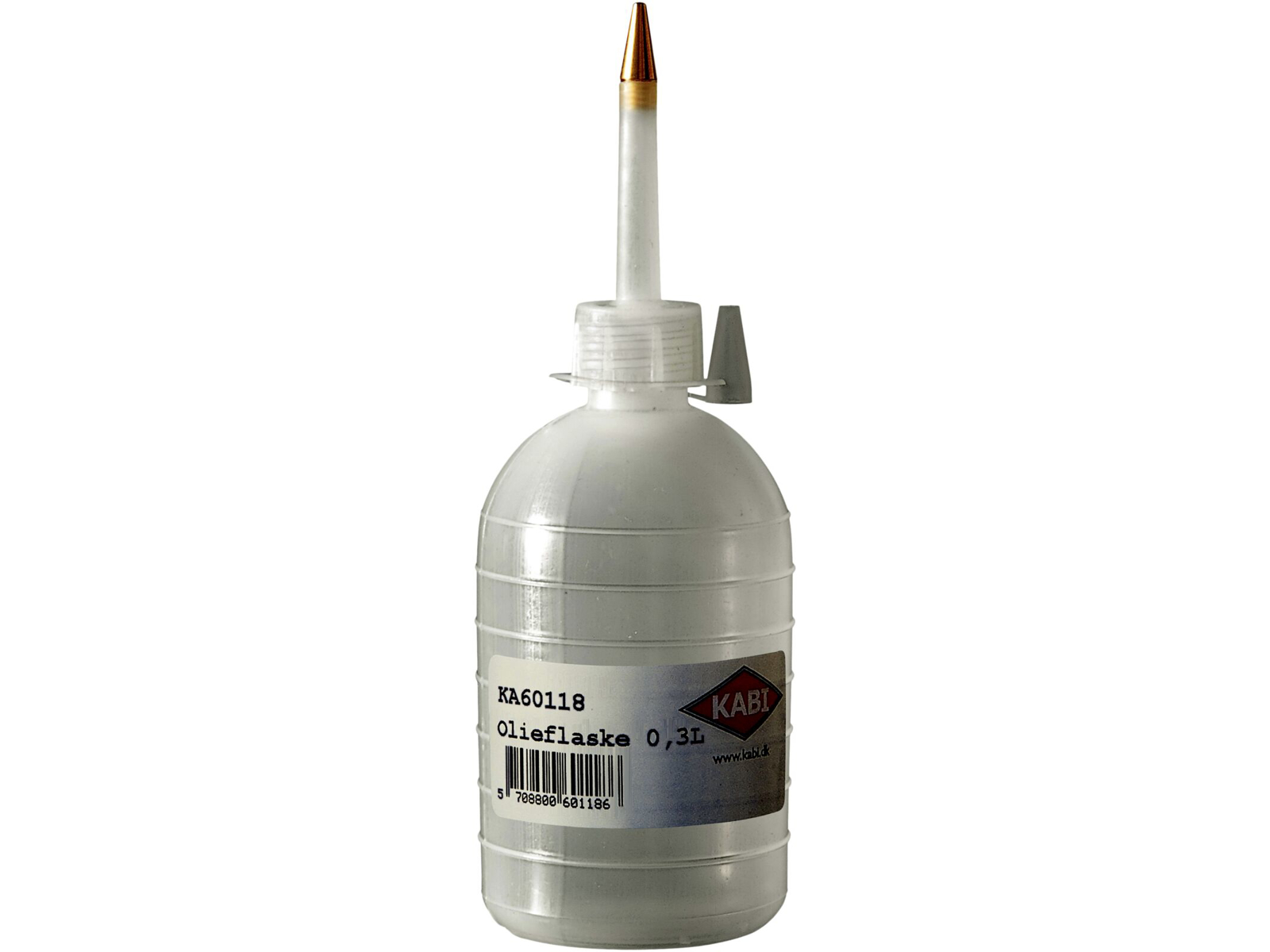 KABI olieflasker. Produceret af Polyethylen (PE). Tud forsynet med messing spids Indhold: 0,3 ltr.