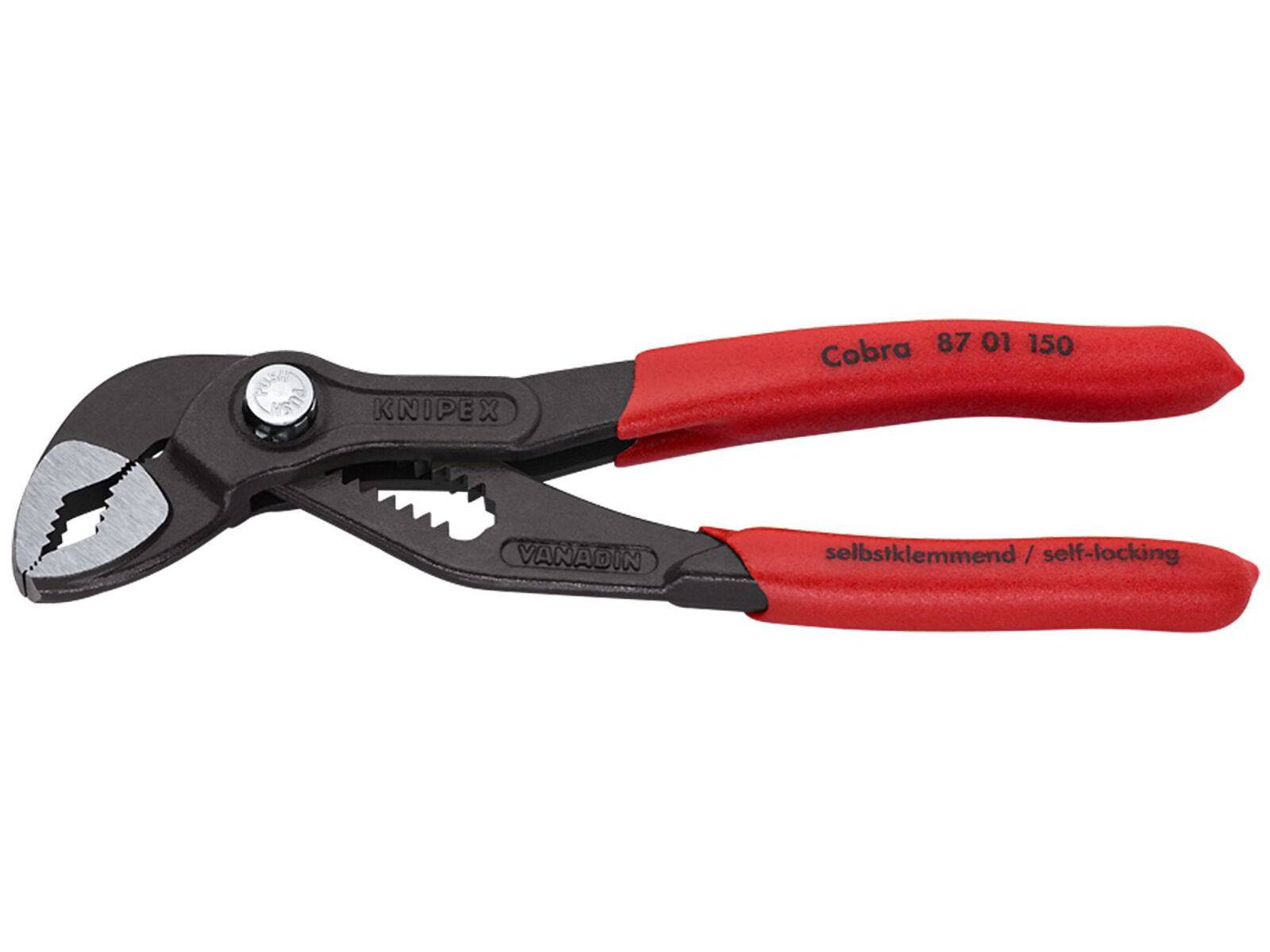 • KNIPEX Cobra grå atramenteret 150 mm. Indstilling ved tryk på en knap direkte ved arbejdsemnet. Finindstilling for optimal tilpasning til forskellige arbejdsemner samt håndvenlig grebstilling. Selvklemmende på rør og møtrikker glider ikke på arbejdsemnet, sparer kraft ved arbejdet. Gribeflader med specialhærdede tænder, tændernes hårdhed ca. 61 HRC. Vedvarende sikkert greb pga. høj slidstyrke. Gennemstukket led i høj stabilitet pga. dobbelt føring. Ledbolten går sikkert i indgreb, og dermed ingen utilsigtet ændring af indstillingen. Klembeskyttelse forhindrer sammenklemningskvæstelser. Krom-Vanadium-elektrostål, smedet og oliehærdet.