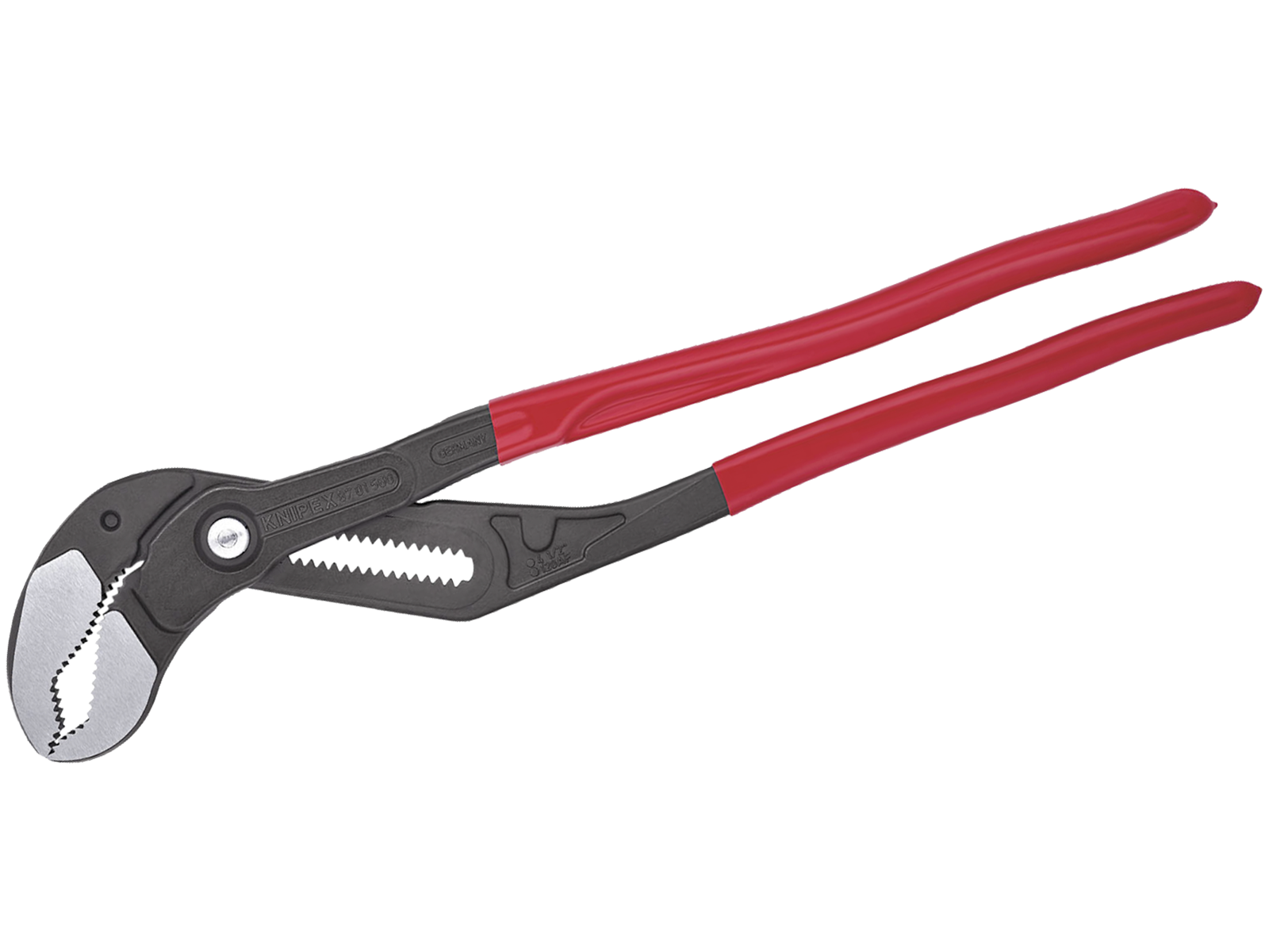 KNIPEX Cobra XL/XXL grå atramenteret 560 mm. Større gribevidde, men langt lavere vægt end tilsvarende rørtænger. Hurtig indstilling ved tryk på en knap direkte ved arbejdsemnet, så leddet ikke glider igennem ved en fejltagelse. Finindstilling for optimal tilpasning til forskellige arbejdsemner samt håndvenlig grebstilling. Selvklemmende på rør og møtrikker glider ikke på arbejdsemnet, sparer kraft ved arbejdet. Gribeflader med specialhærdede tænder, tændernes hårdhed ca. 61 HRC. Vedvarende sikkert greb pga. høj slidstyrke. Gennemstukket led i høj stabilitet pga. dobbelt føring. Klembeskyttelse forhindrer sammenklemningskvæstelser. Krom-Vanadium-elektrostål, smedet og oliehærdet.
