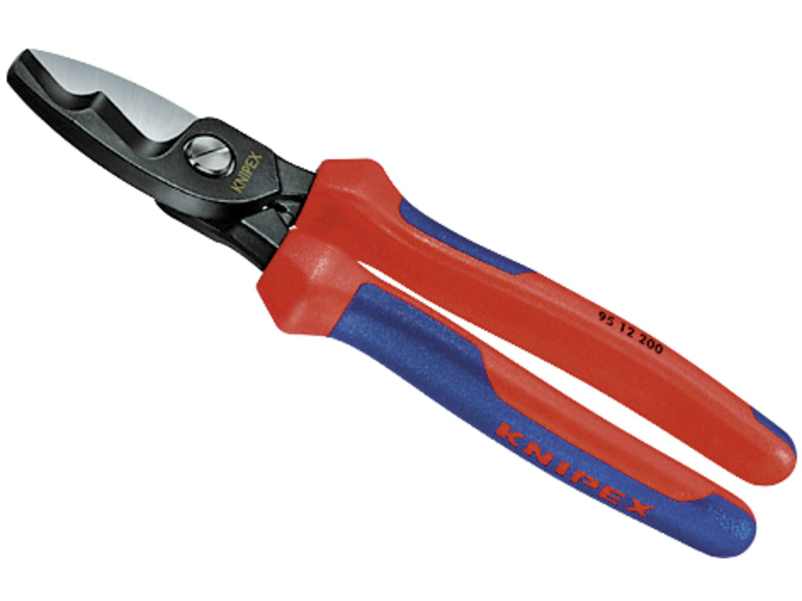 Kabelsaks med dobbeltskær med flerkomponent-håndtag 200 mm. Til at skære Cu- og Al-kabler. Uegnet til ståltråd og hårdttrukne kobberledere. Hærdede skær med præcisionsslibning. Skærer glat og ordentligt uden at klemme. Ved opdelingen af skæreprocessen i forsnit (isoleringskappe i forreste skærområde) og eftersnit (leder i bageste skærområde) kan der skæres op til Ø20 mm-kabler med én hånd. Kun lille opbydelse af kraft på grund af gode udvekslingsforhold og optimeret skærgeometri. Klembeskyttelse forhindrer sammenklemningskvæstelser. Justerbart skrueled, selvsikrende. Special-værktøjsstål af særlig kvalitet, smedet, oliehærdet.